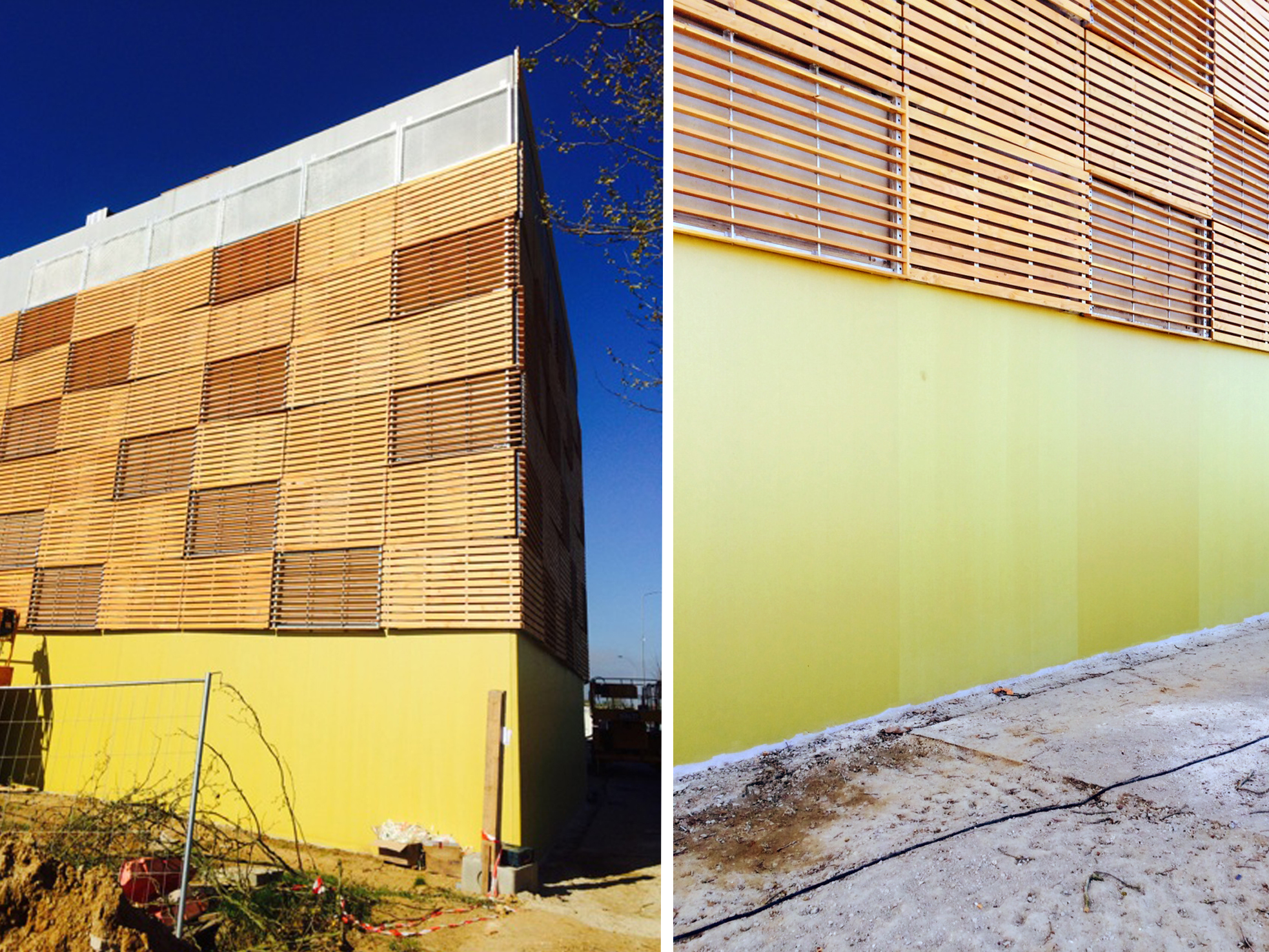 The last step before the completion of the new biomass boiler … It will soon take part in the Camille Claudel Eco-quartier in Palaiseau, which is currently under construction. Assembly of the facade began today. The slatted panels arranged in cladding along the concrete envelope will create an undulation responding to the place !