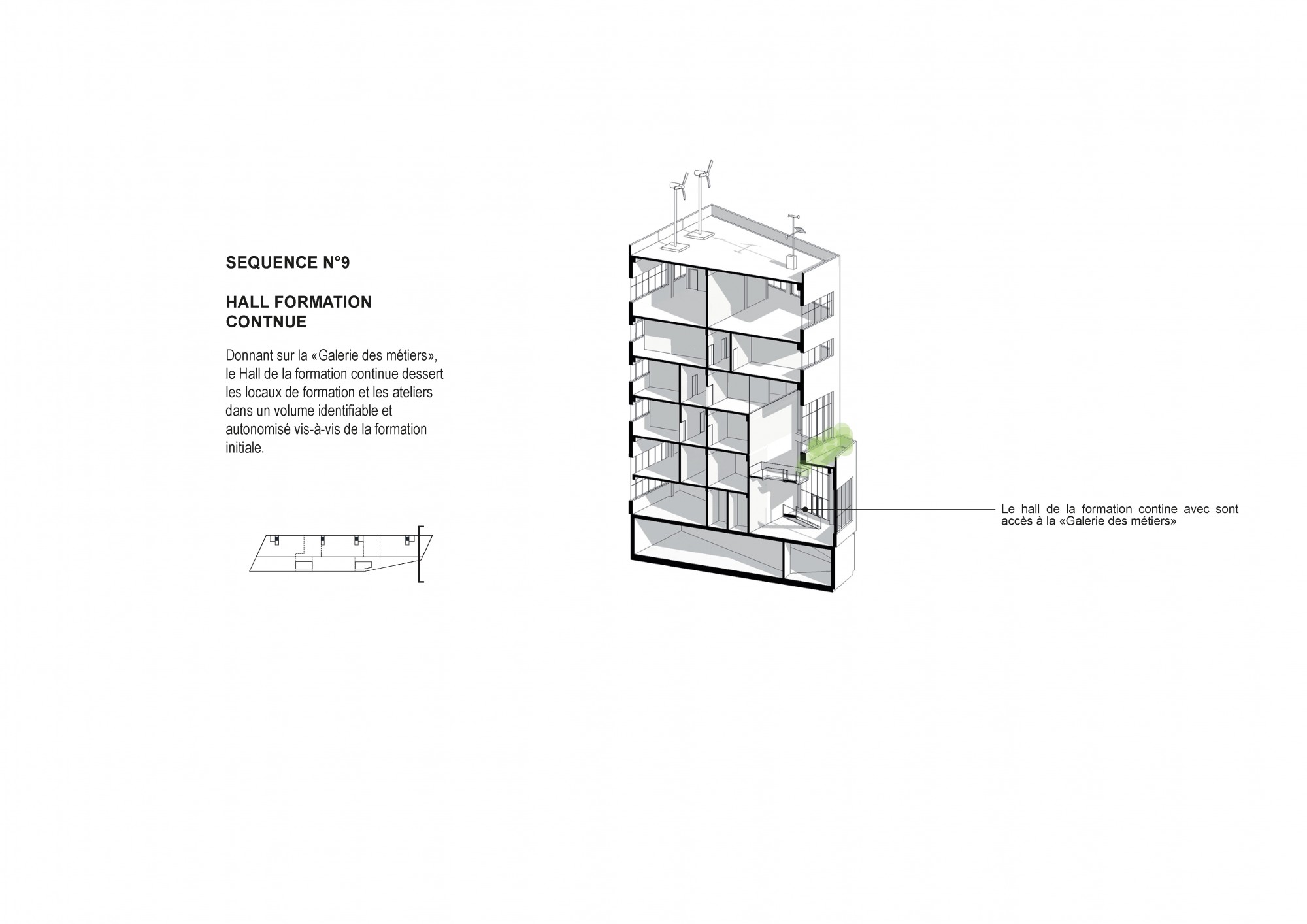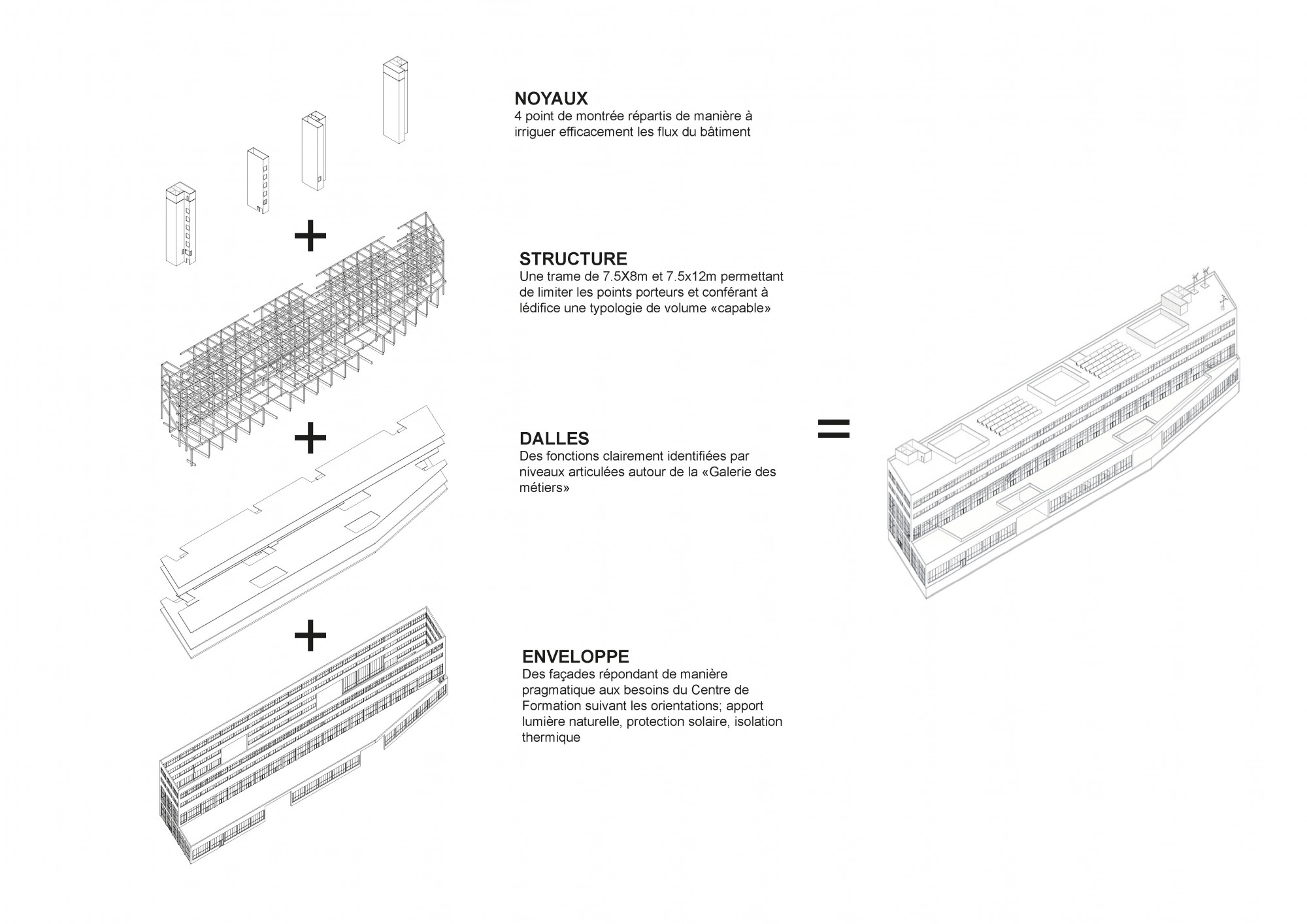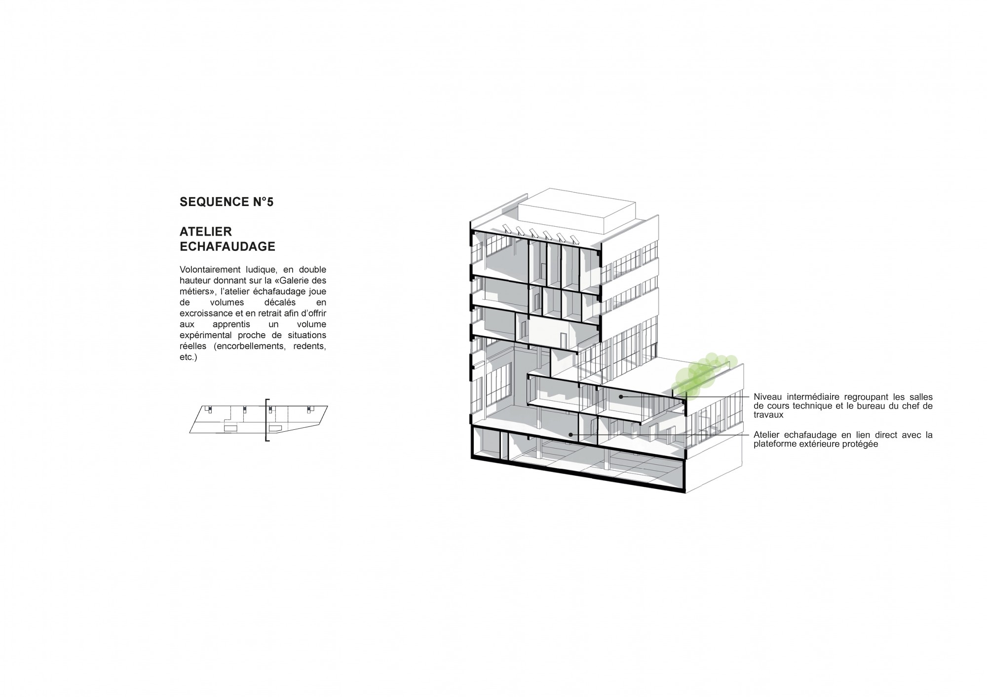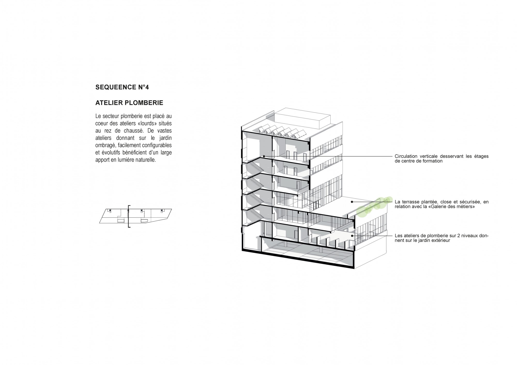 The project aims to create the conditions for multidisciplinary learning, based on shared spaces that encourage mixed use and interaction between different trades. The proposed architecture adapts to the diversity of the program while ensuring overall clarity and functional efficiency in the service of knowledge transfer.
