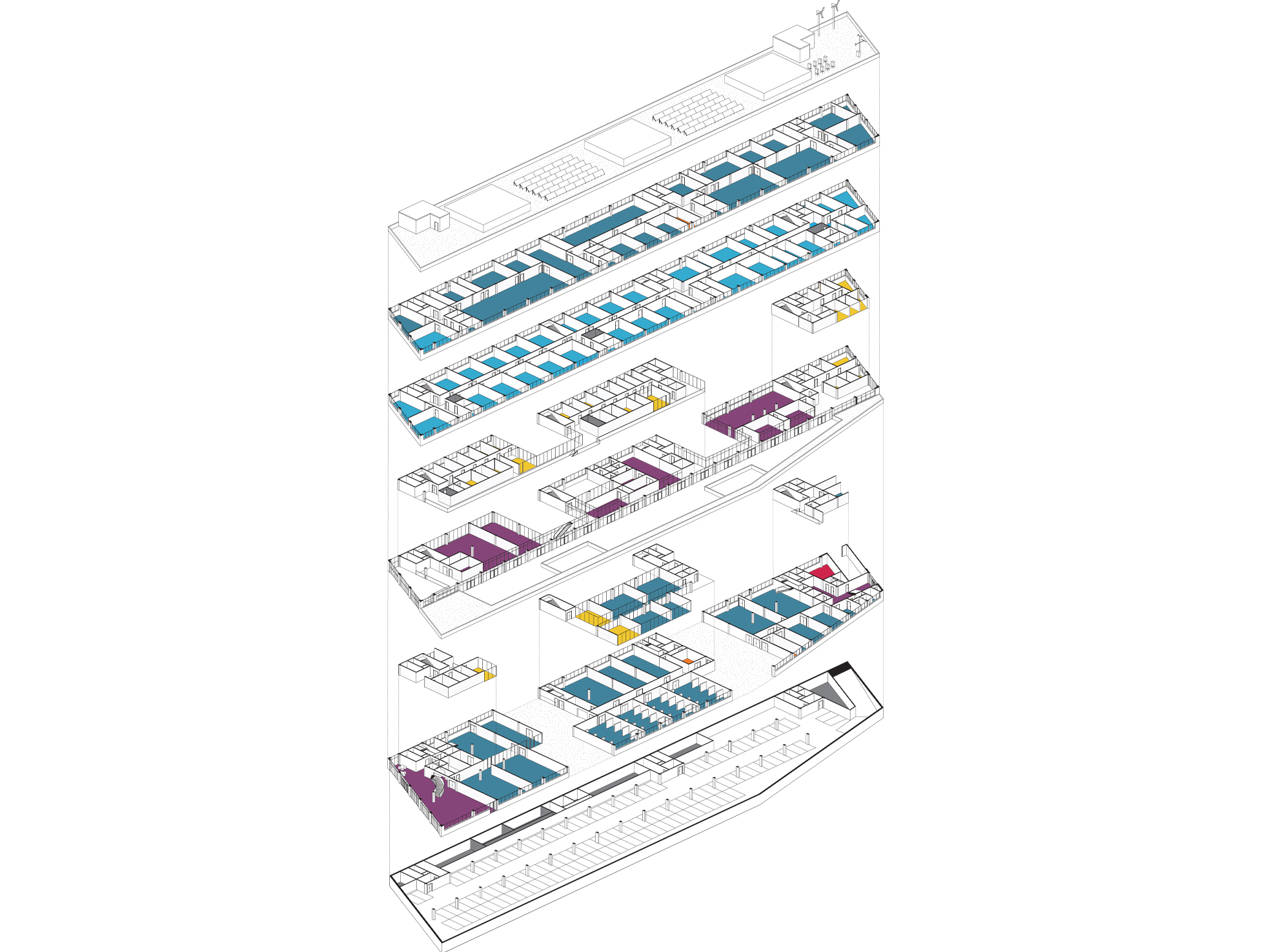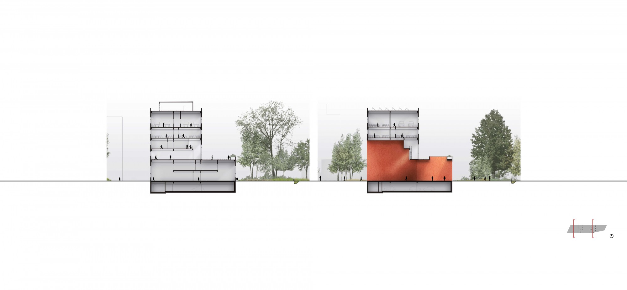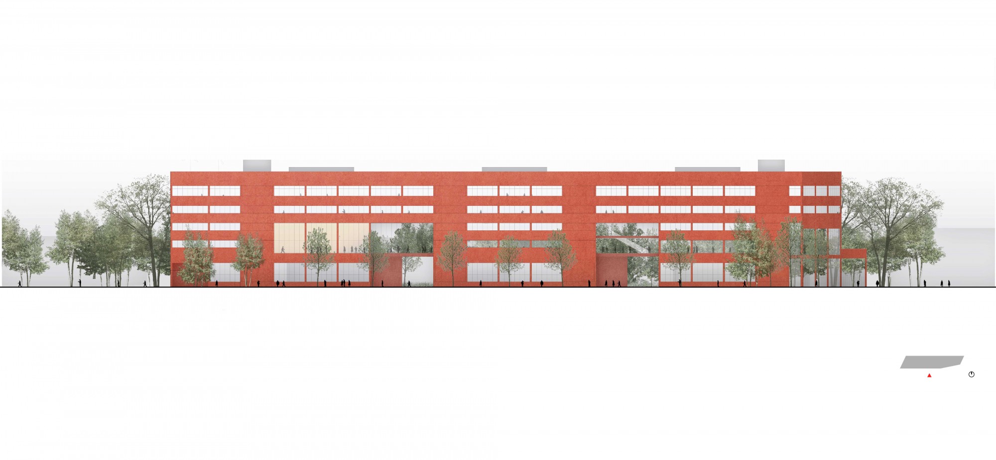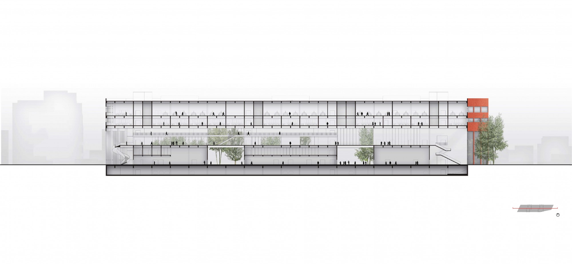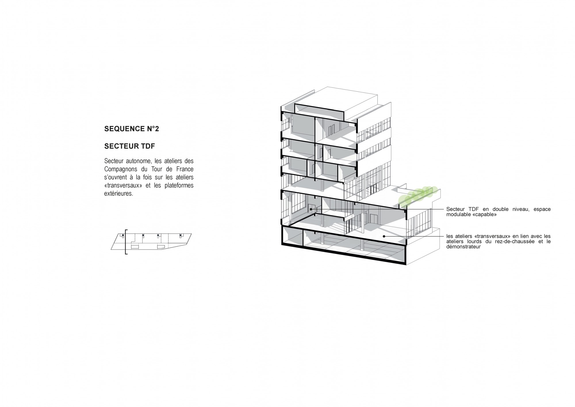 The building has a compact and modular design, facilitating future programmatic changes. This compactness optimizes traffic flow, rationalizes surface areas, and respects the operational constraints of the various activity centers.