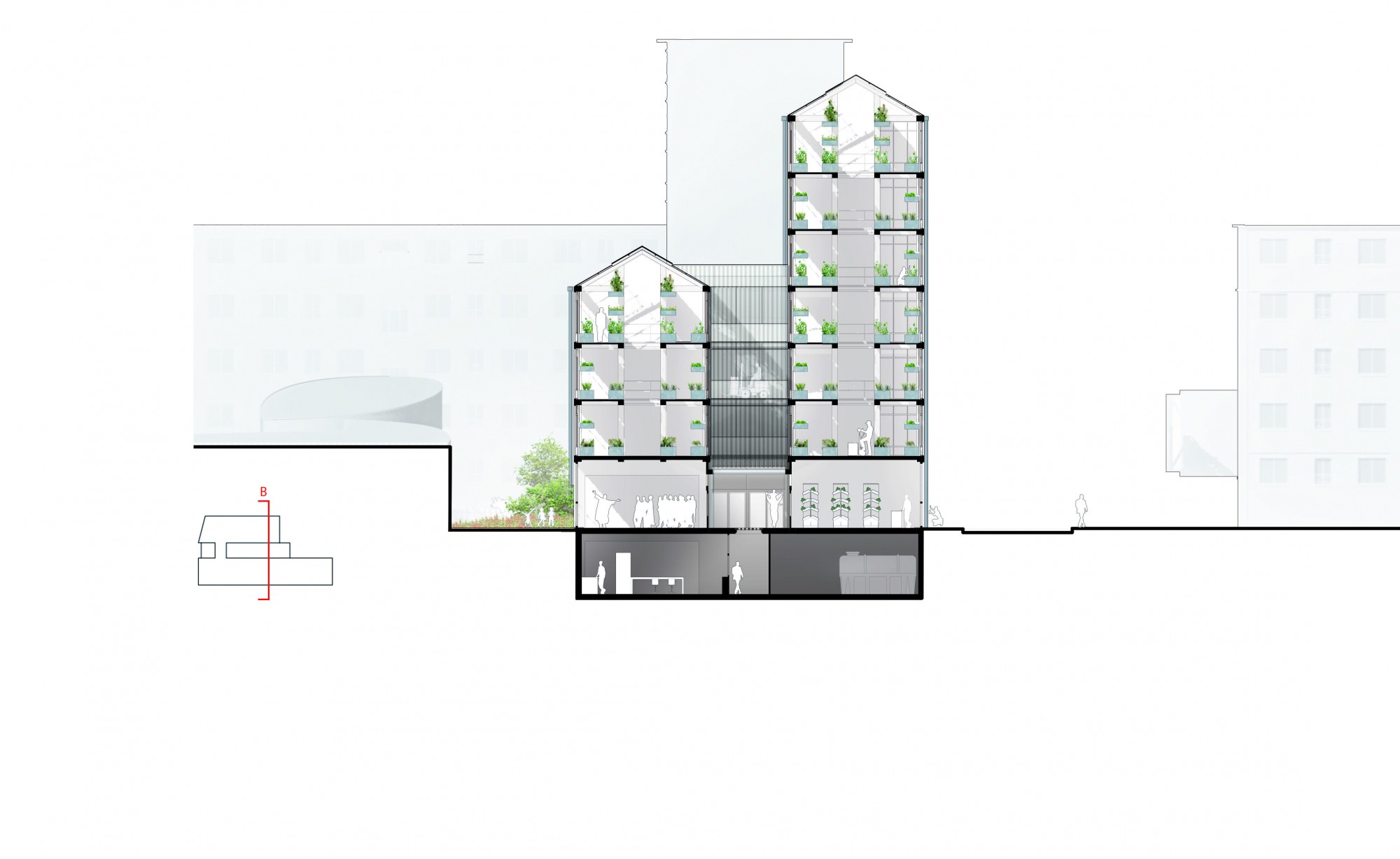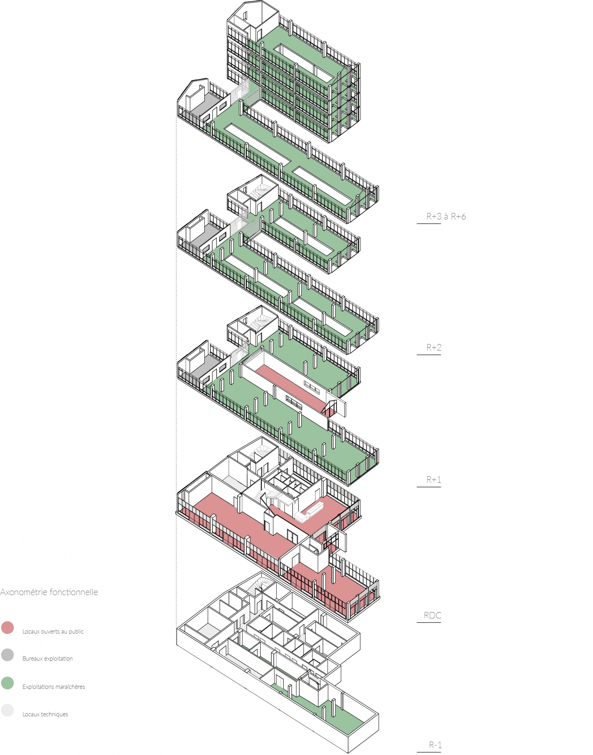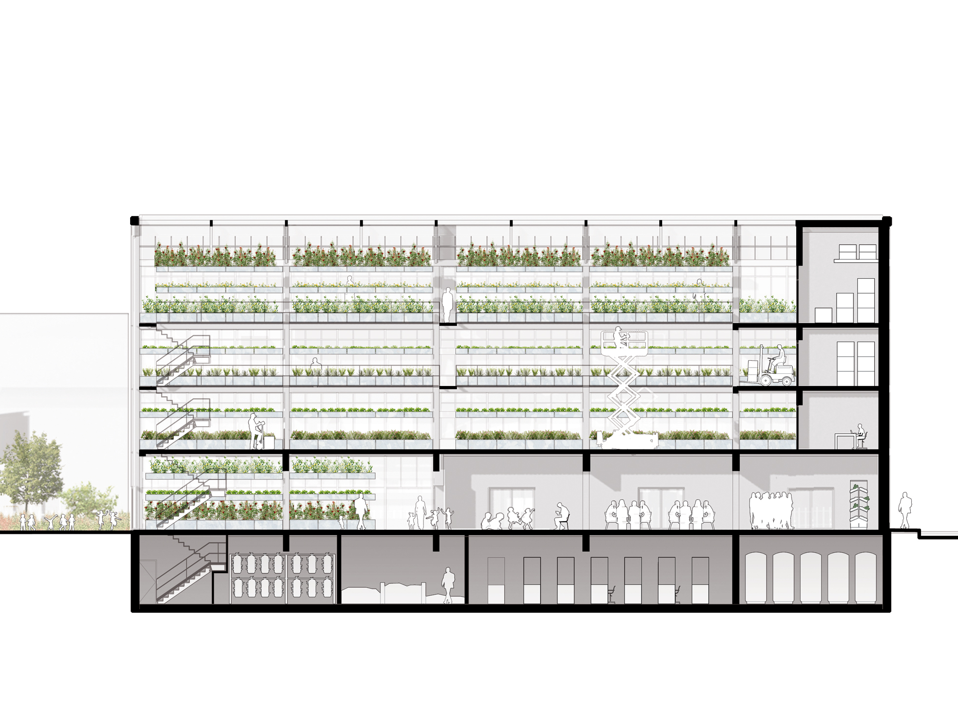 The basement houses specific production (mushrooms, endives, sprouted seeds…), as well as storage, packaging areas, cold rooms, washing stations, and laboratories.