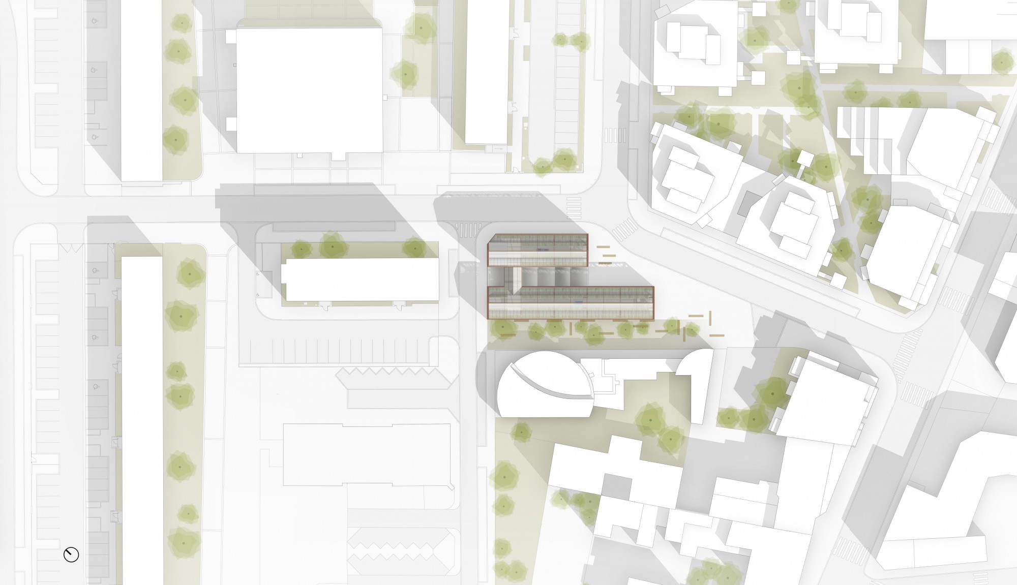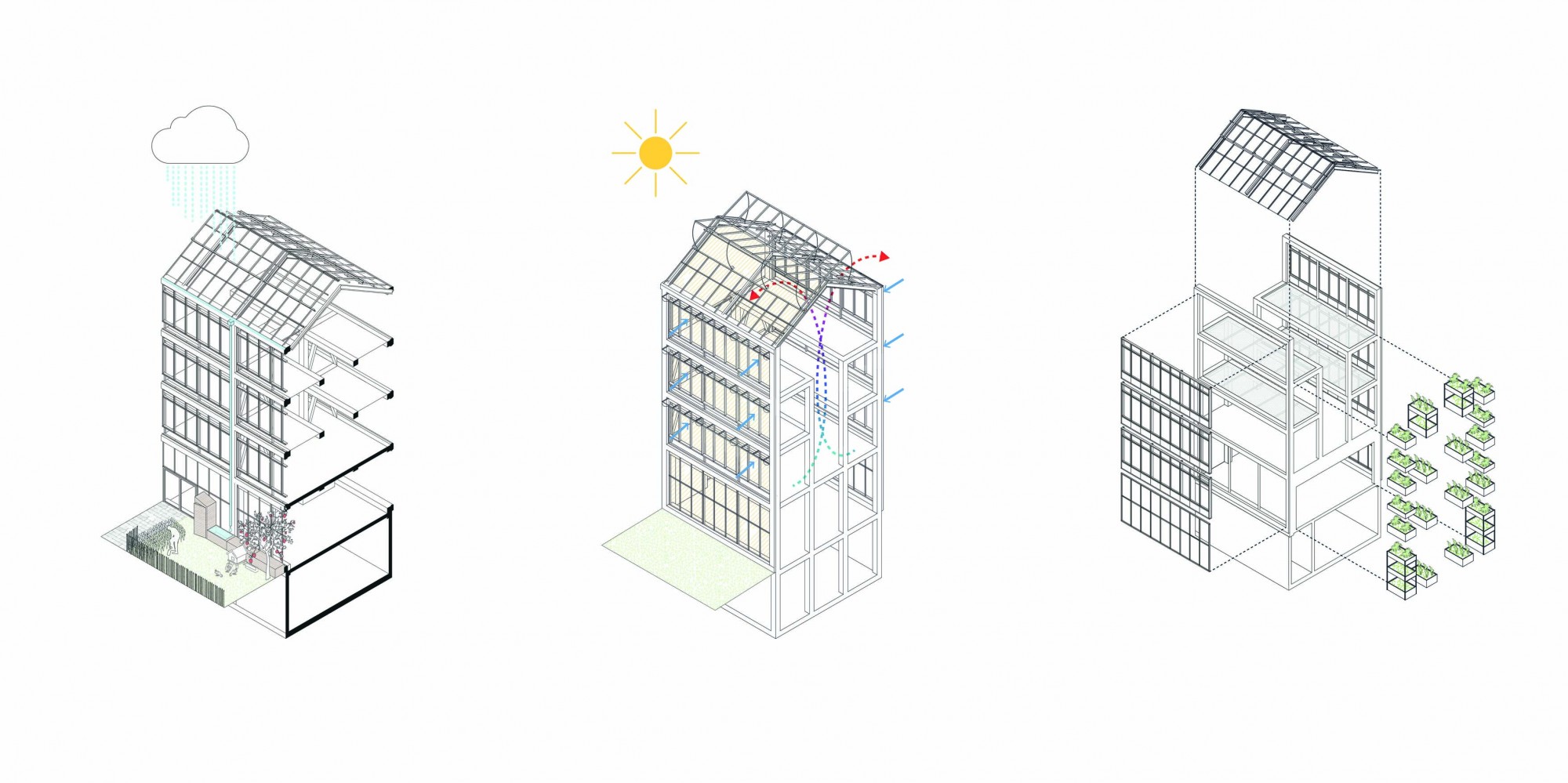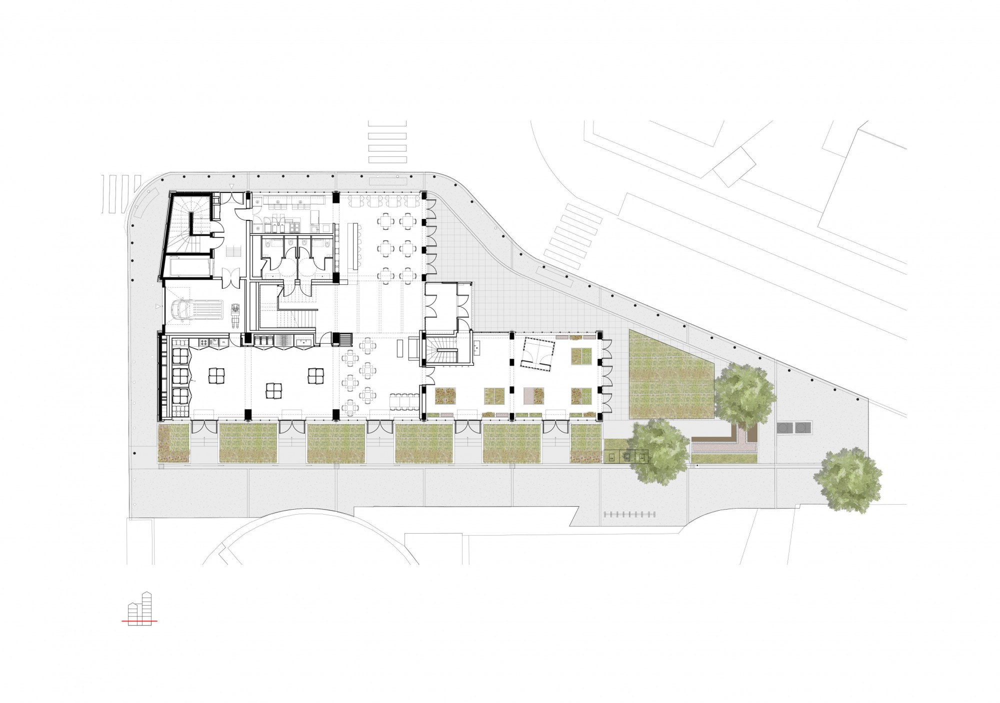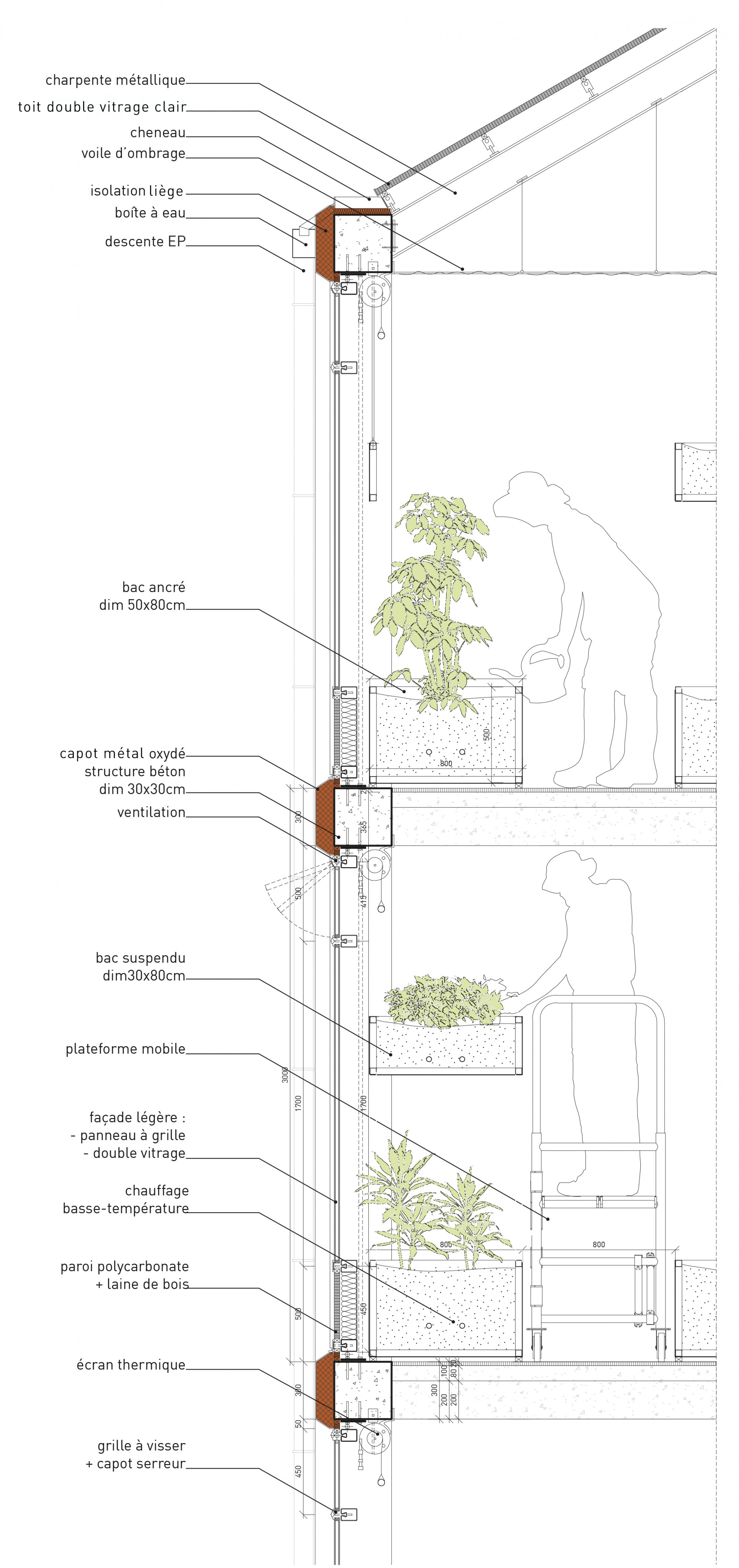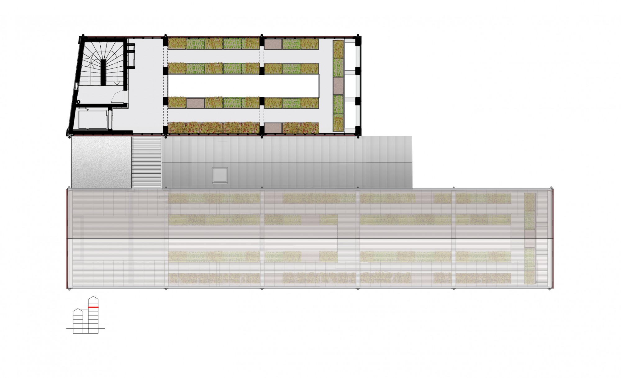 Outside, a teaching garden extends from the west greenhouse. At the rear, a space is dedicated to delivery and handling.