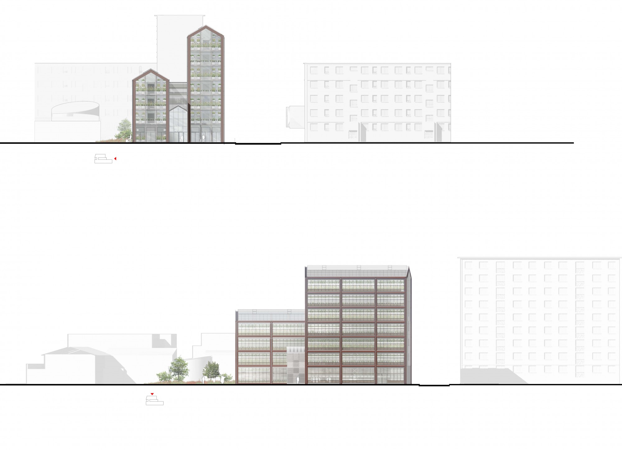 The Cité Maraîchère is organized into two 7-meter-wide wings: