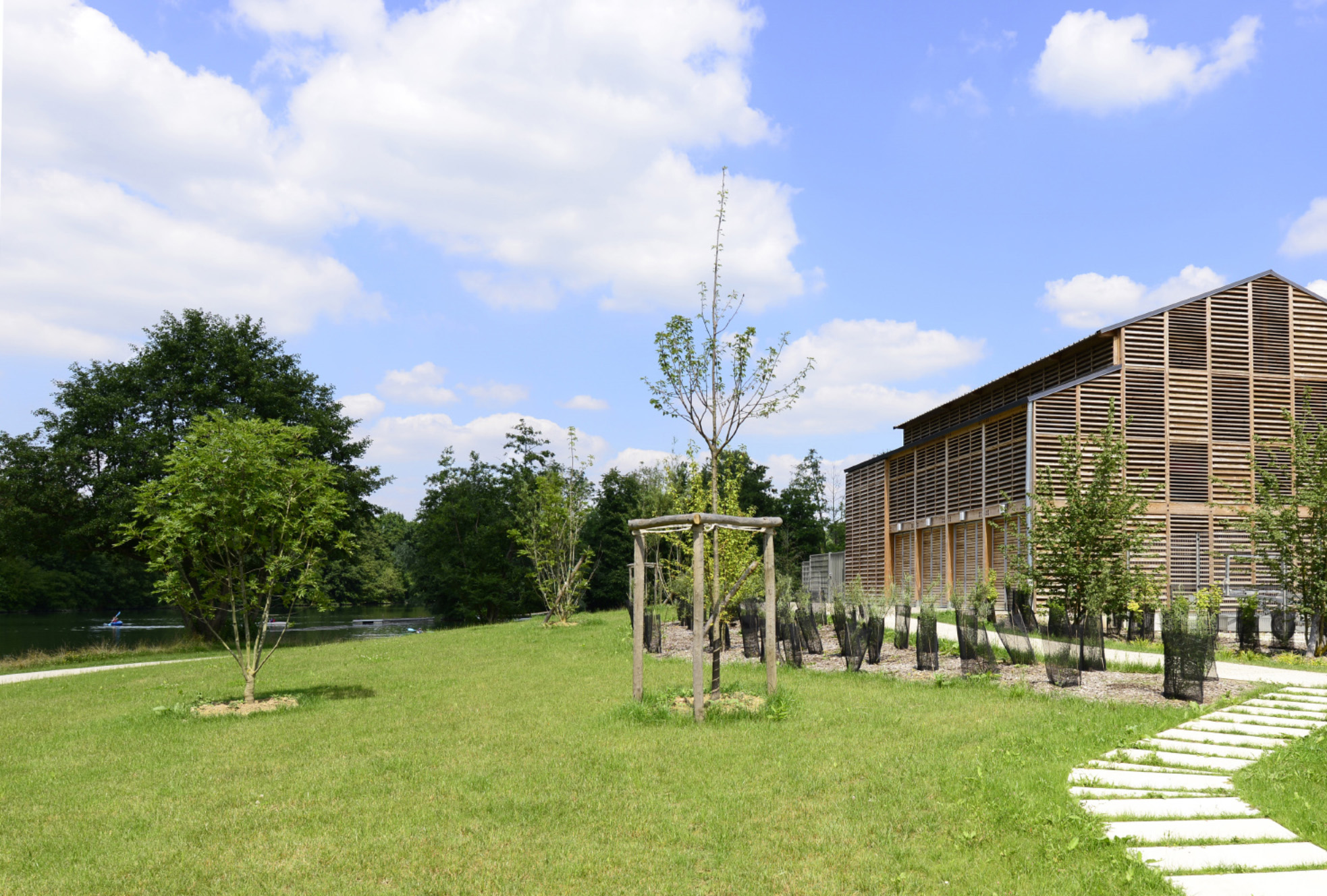 Inspired by agricultural hangars with flaps (natural ventilation for boats), the nautical center built in wood on stilts evokes a lakeside town nestled along the banks of the Marne.