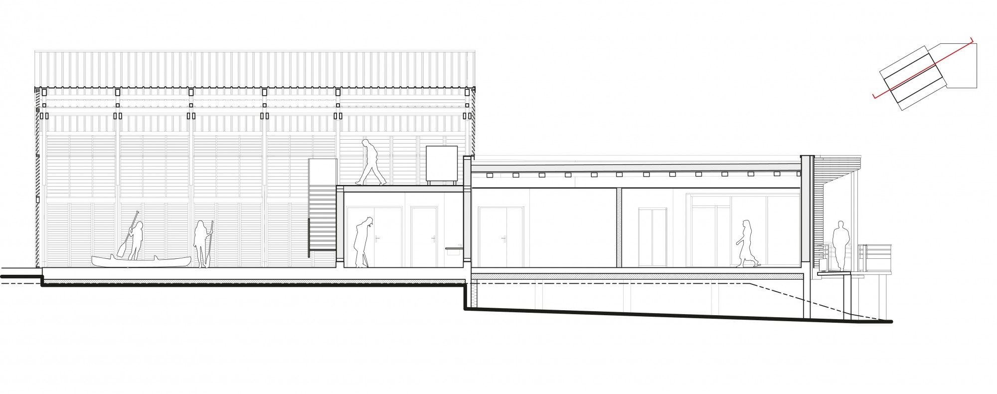 The nautical center is organized around several entities: the existing changing room building, to which are added a boathouse, a repair shop, a drying room, a weight room, an office, and a clubhouse.
