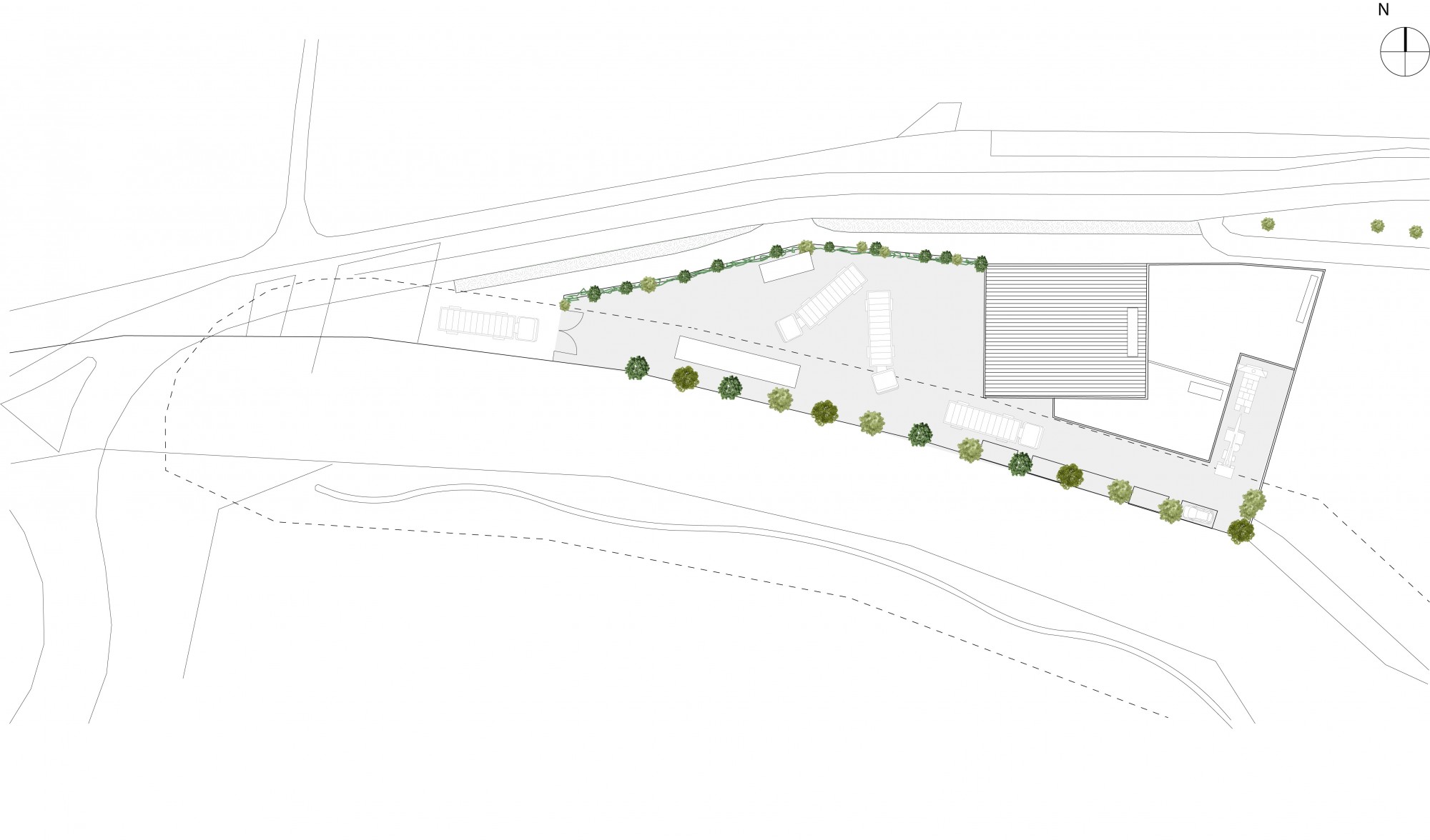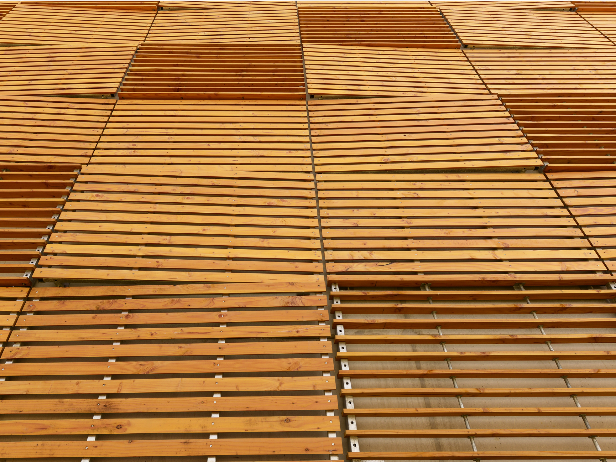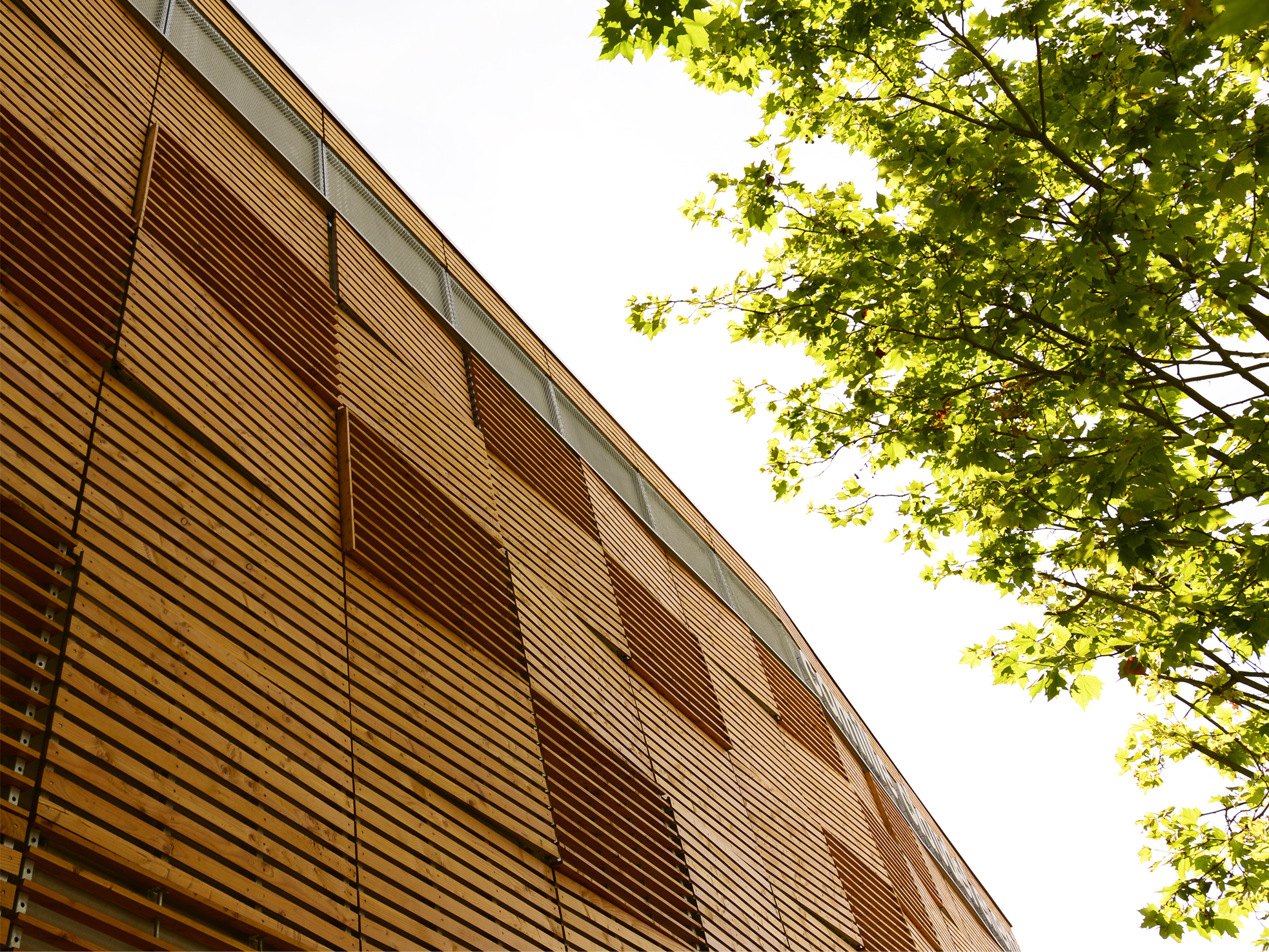 Située en vis-à-vis de la place des Écoles et de la Victoire, elle s’affirme comme un équipement à la fois fonctionnel et intégré. Sa façade se compose de panneaux claustra en lames de bois aux teintes brun-miel, surmontée d’un attique en métal déployé brut. Le soubassement en béton est quant à lui habillé d’une lasure semi-transparente dans des nuances dorées, conférant à l’ensemble une matérialité chaleureuse et soignée.