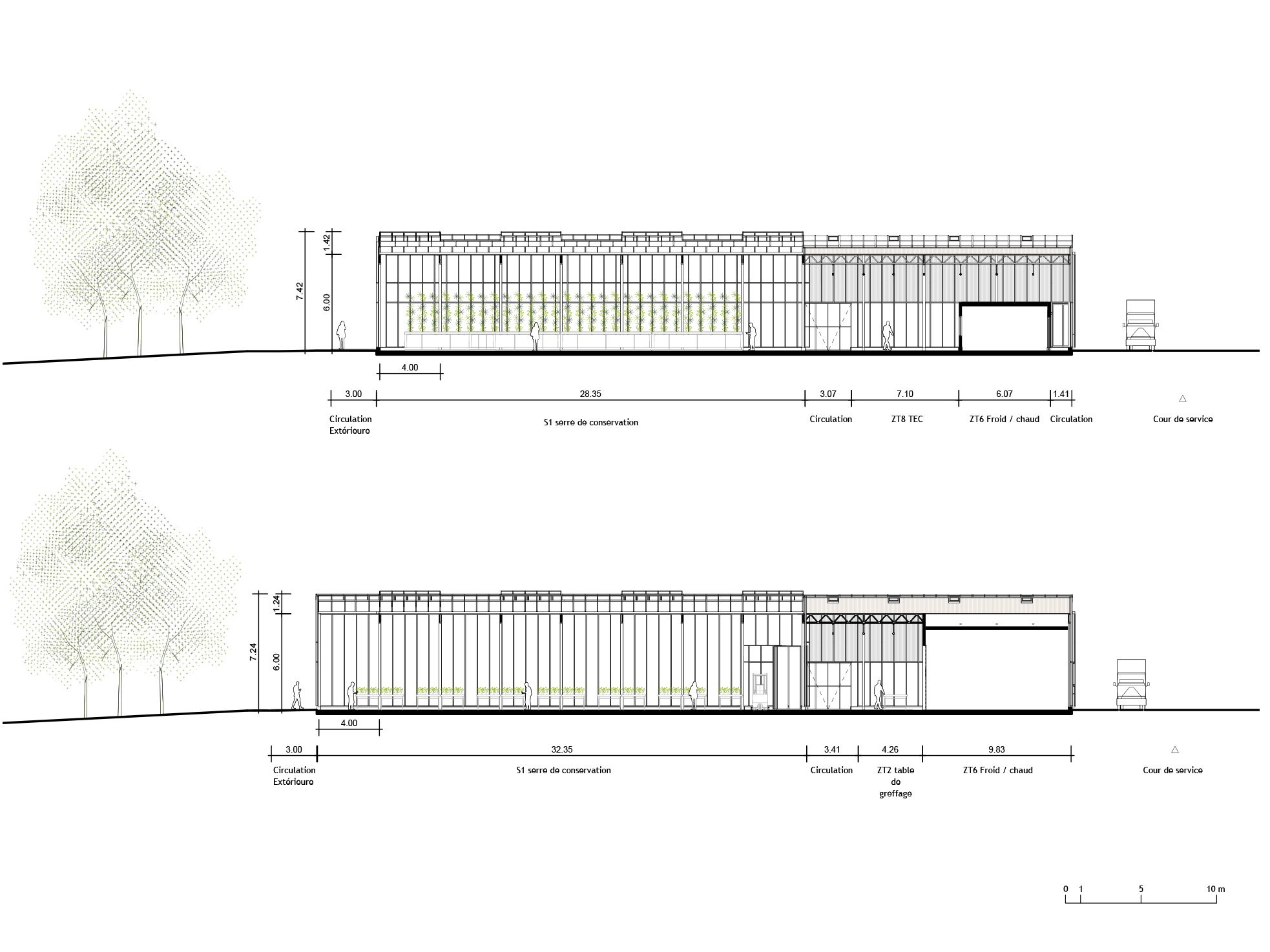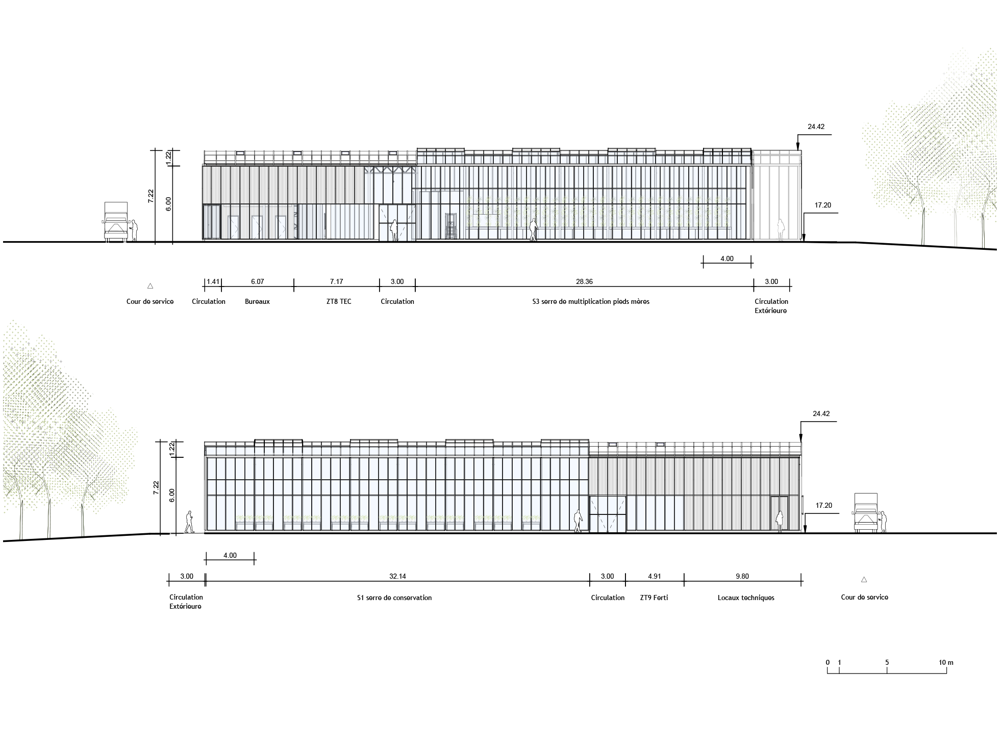 Le projet s’organise en strates fonctionnelles autour de deux axes perpendiculaires, depuis les locaux techniques au nord jusqu’aux serres dédiées à la conservation et à la multiplication des plants de vigne au sud. Une structure poteau-poutre de type Venlo, modulaire et préfabriquée, assure flexibilité d’usage et évolutivité. La démarche bas-carbone privilégie les matériaux biosourcés et géosourcés, pour un bâtiment simple, durable et adapté aux besoins du site.