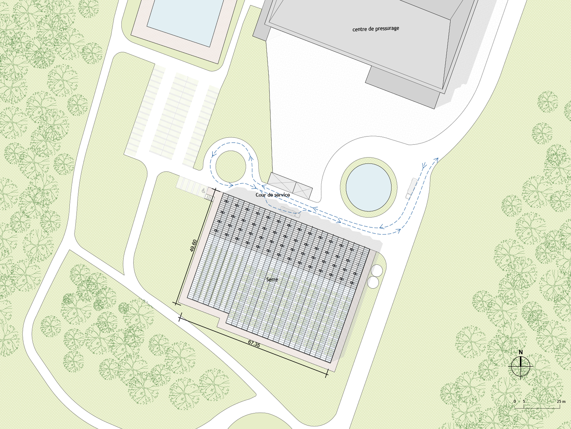 Le bâtiment s’organise selon deux axes perpendiculaires nord-sud et est-ouest, structurant les usages en strates successives. Depuis la cour de service située au nord jusqu’aux serres de conservation et de multiplication des plants de vigne au sud, chaque espace répond à une fonction précise.