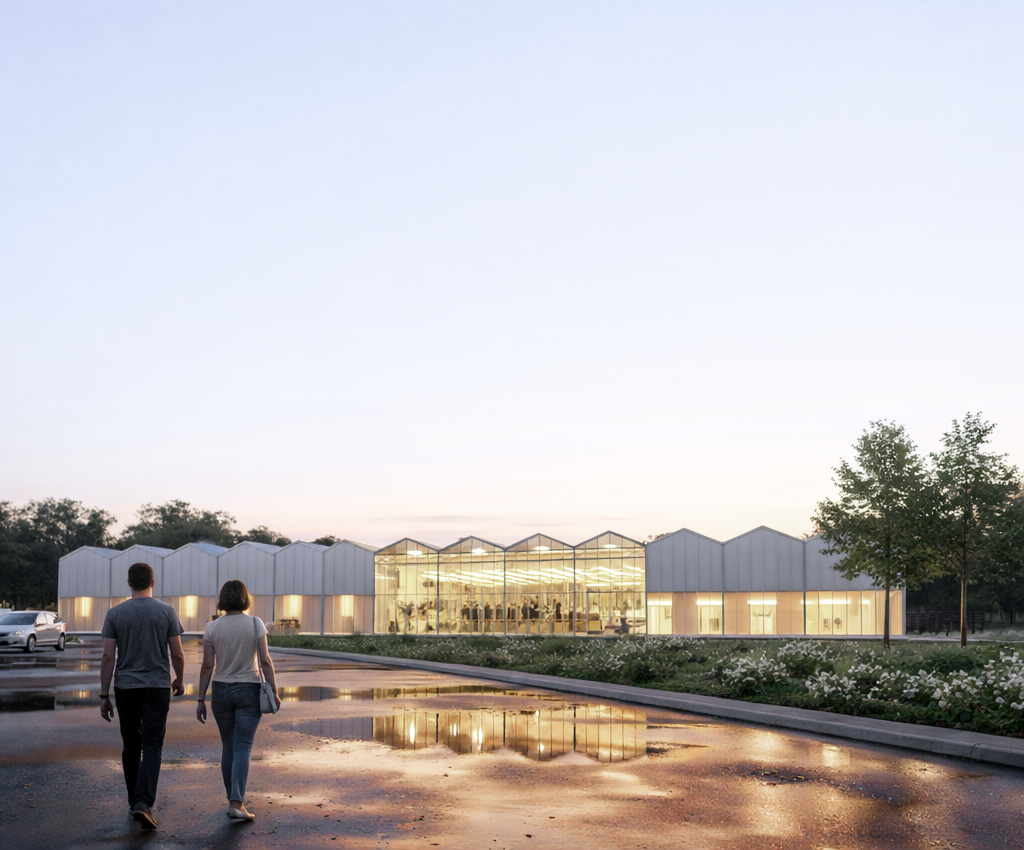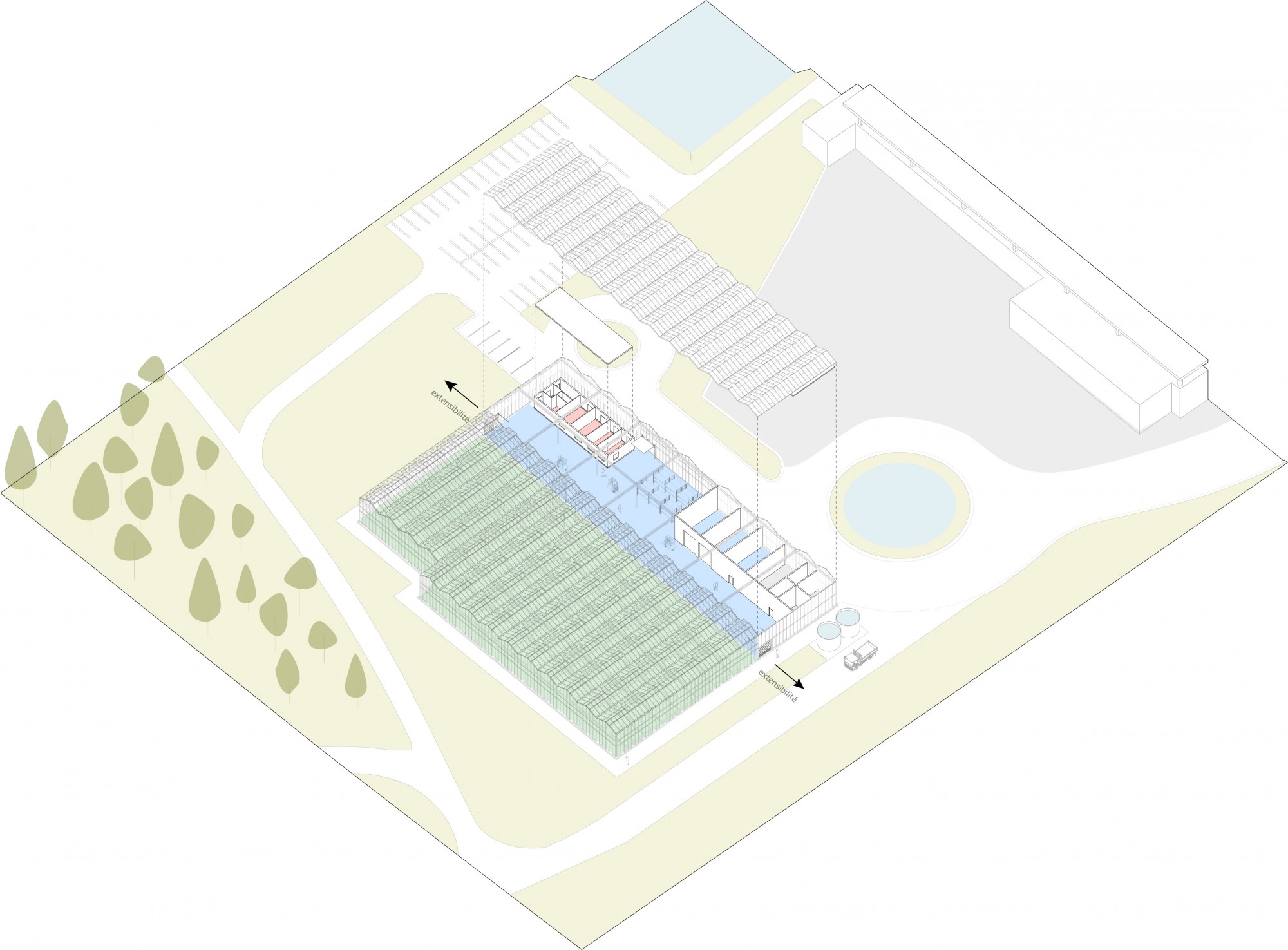 La forme architecturale retenue – un parallélépipède à toit double pente – permet d’optimiser l’éclairement naturel et d’offrir une base évolutive pour d’éventuelles extensions des serres ou des locaux techniques.