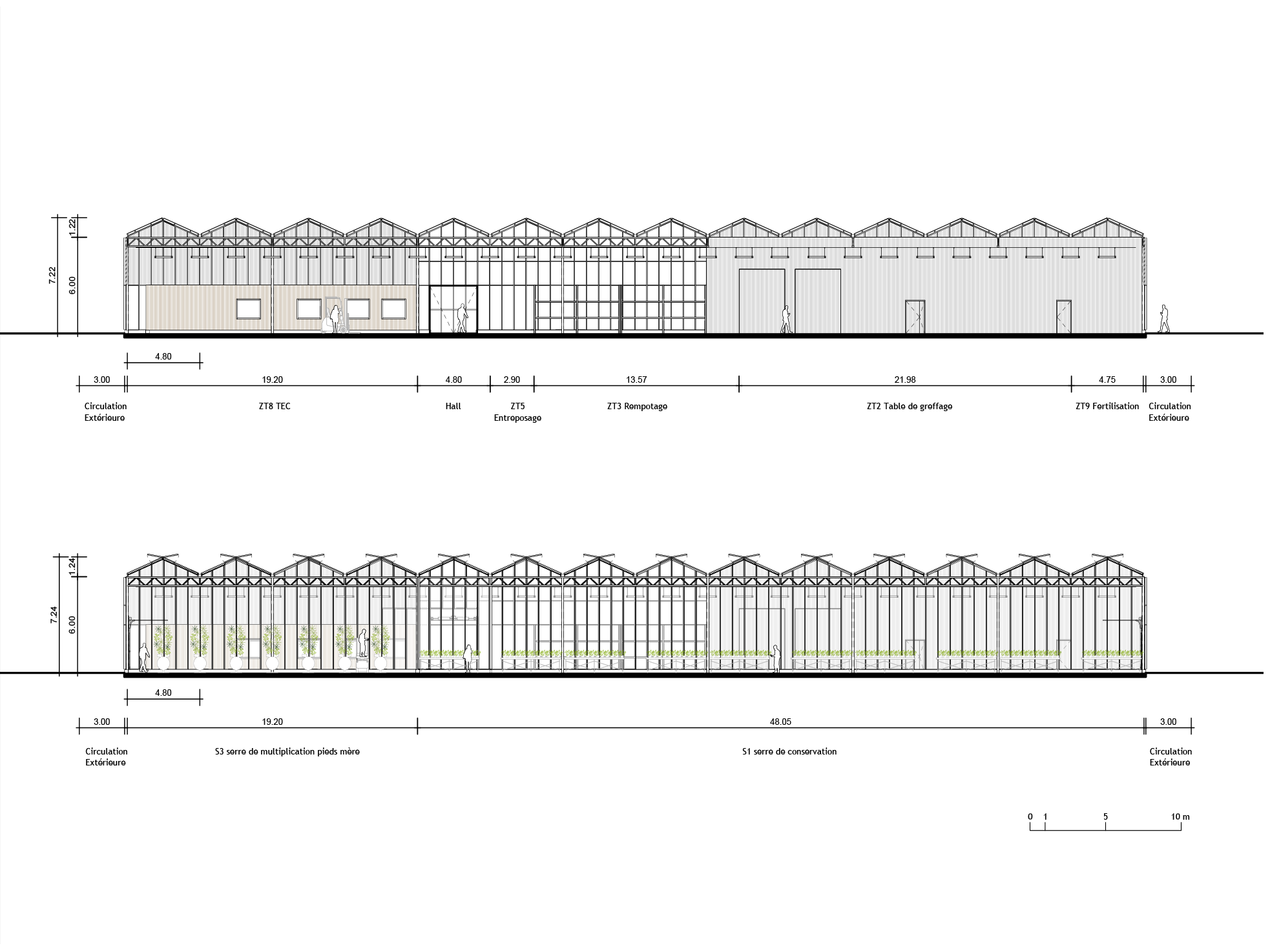 Le projet repose sur un système poteau-poutre inspiré du modèle « Venlo », avec une trame de 4 m × 9,6 m pour les serres, garantissant clarté structurelle, transparence et efficacité constructive. Le hall technique adopte une trame analogue, adaptée à une toiture isolée et opaque, conforme aux normes des établissements accueillant des travailleurs.