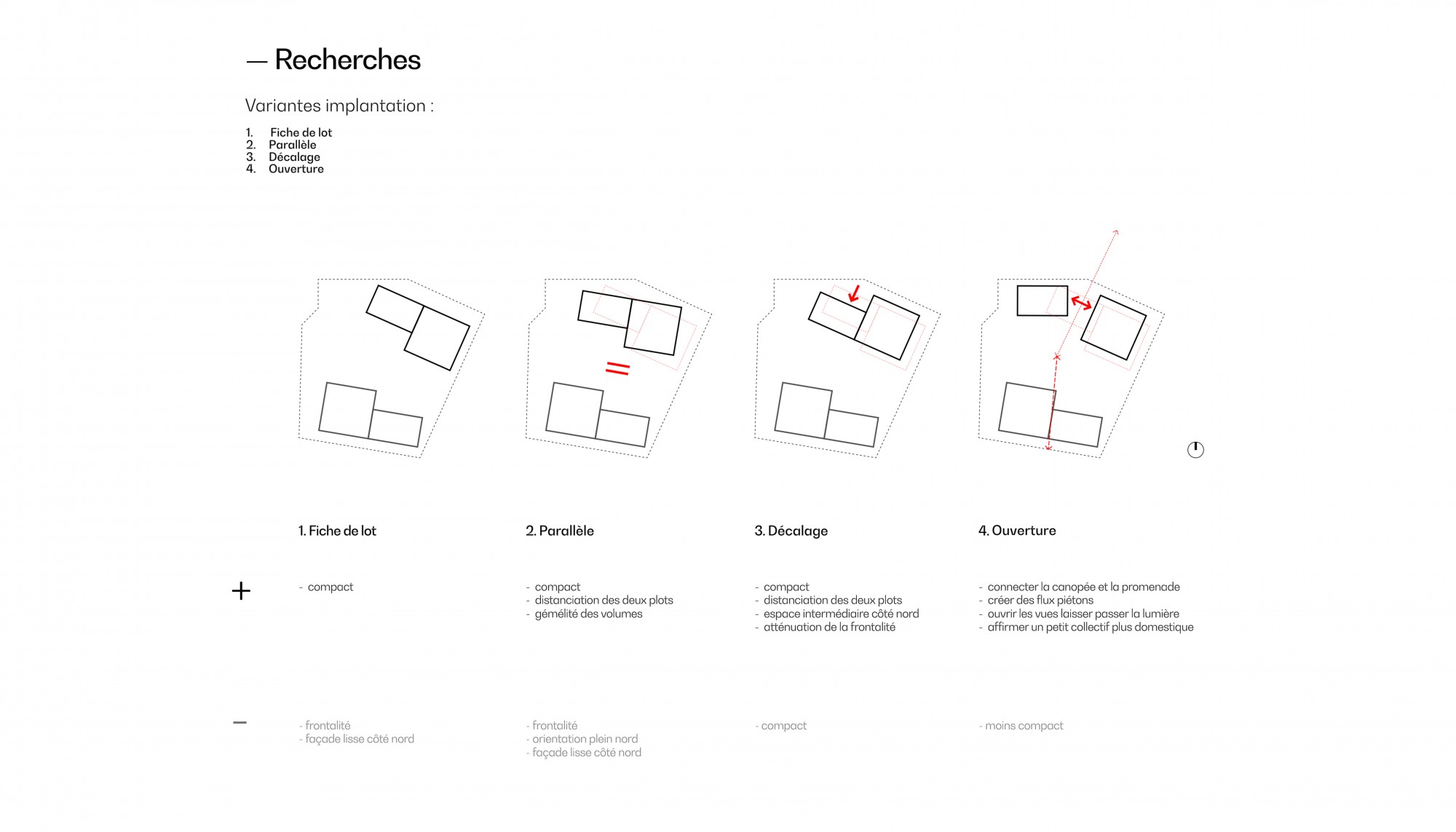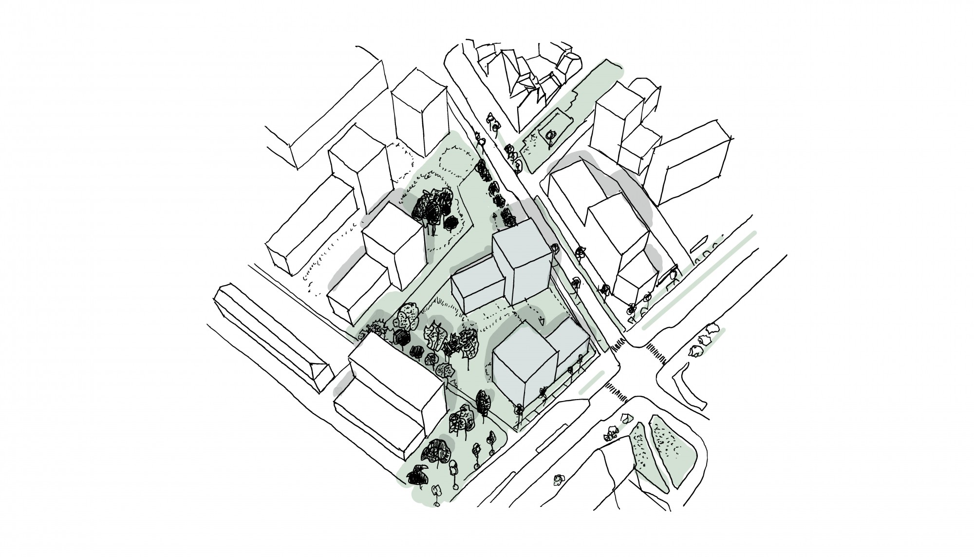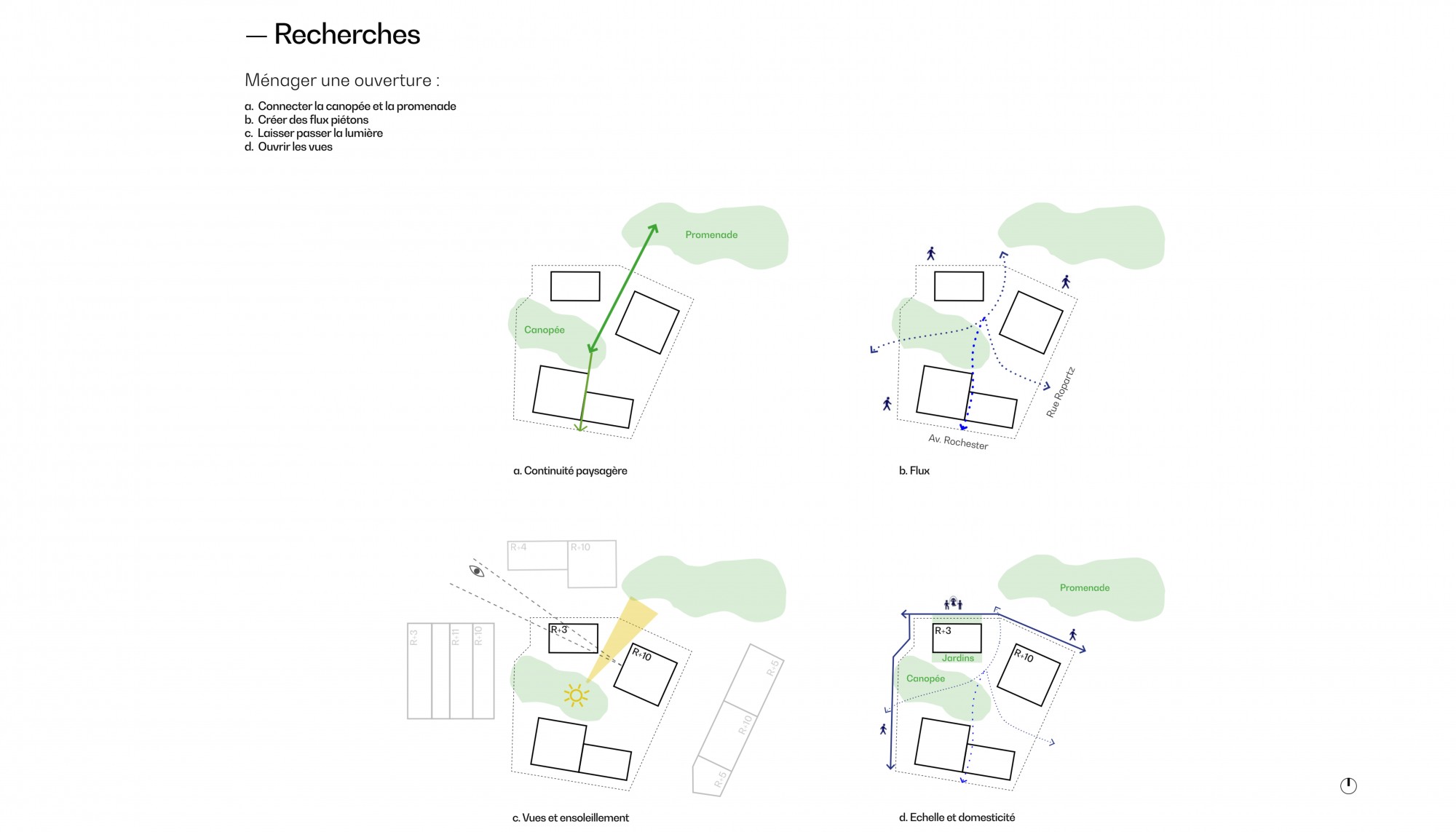 Le site, situé à la croisée de l’avenue de Rochester et de la rue Ropartz, s’ouvre sur un grand jardin ; il offre l’opportunité de penser la transition entre l’avenue et le paysage. Le projet s’appuie sur cette situation d’interface pour ménager un contact généreux entre le bâti et le sol. Le rez-dechaussée, largement ajouré, accueille les traversées, les halls et les locaux partagés ; il fait respirer la ville. L’habitat s’élève ensuite en deux ensembles orientés nord-sud, dont les masses alternent selon les niveaux : un socle à R+3/4 formant la base urbaine, surmonté de tours à R+10 qui émergent audessus de la canopée. Entre ces deux régimes — l’horizontalité du socle et la
