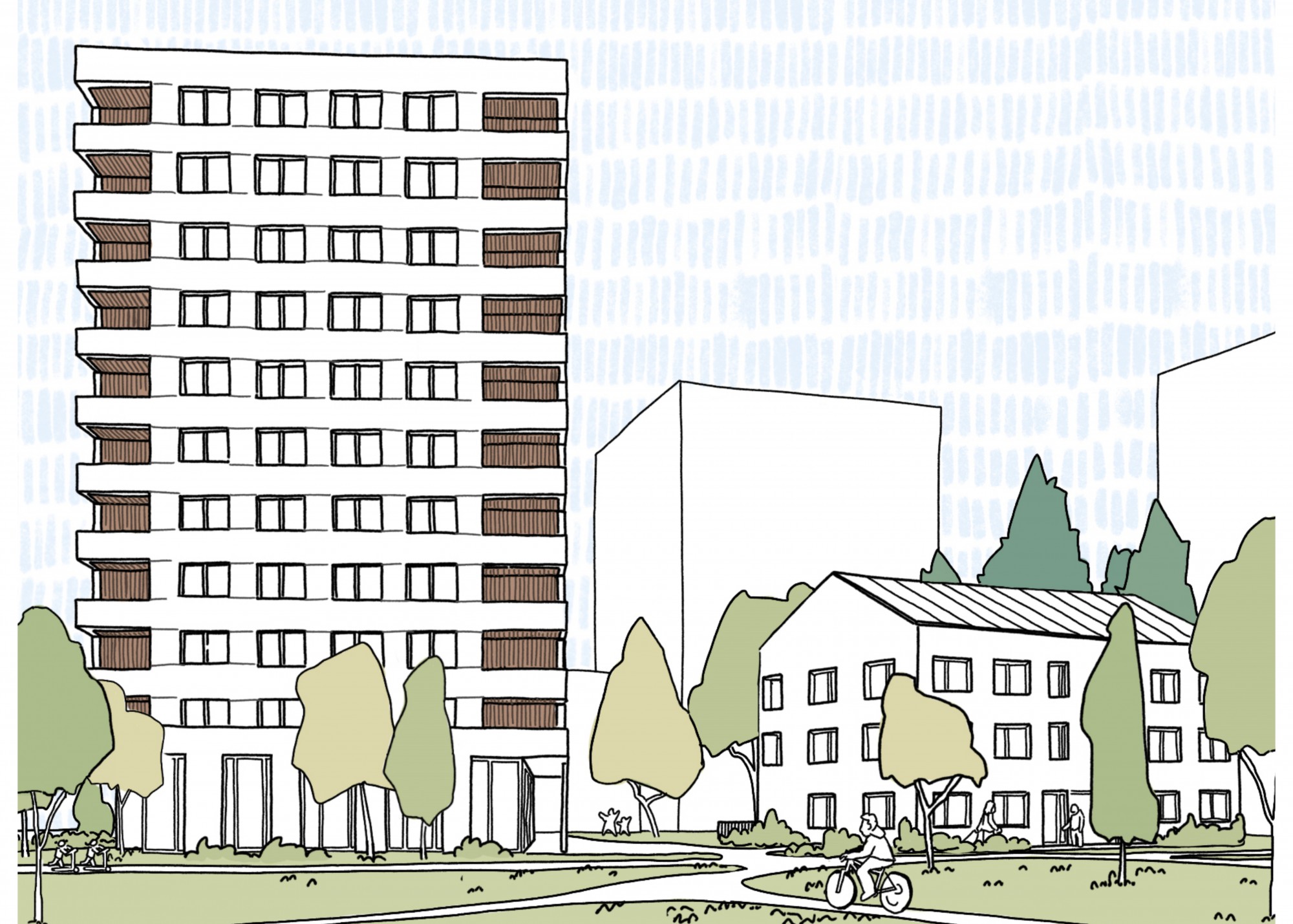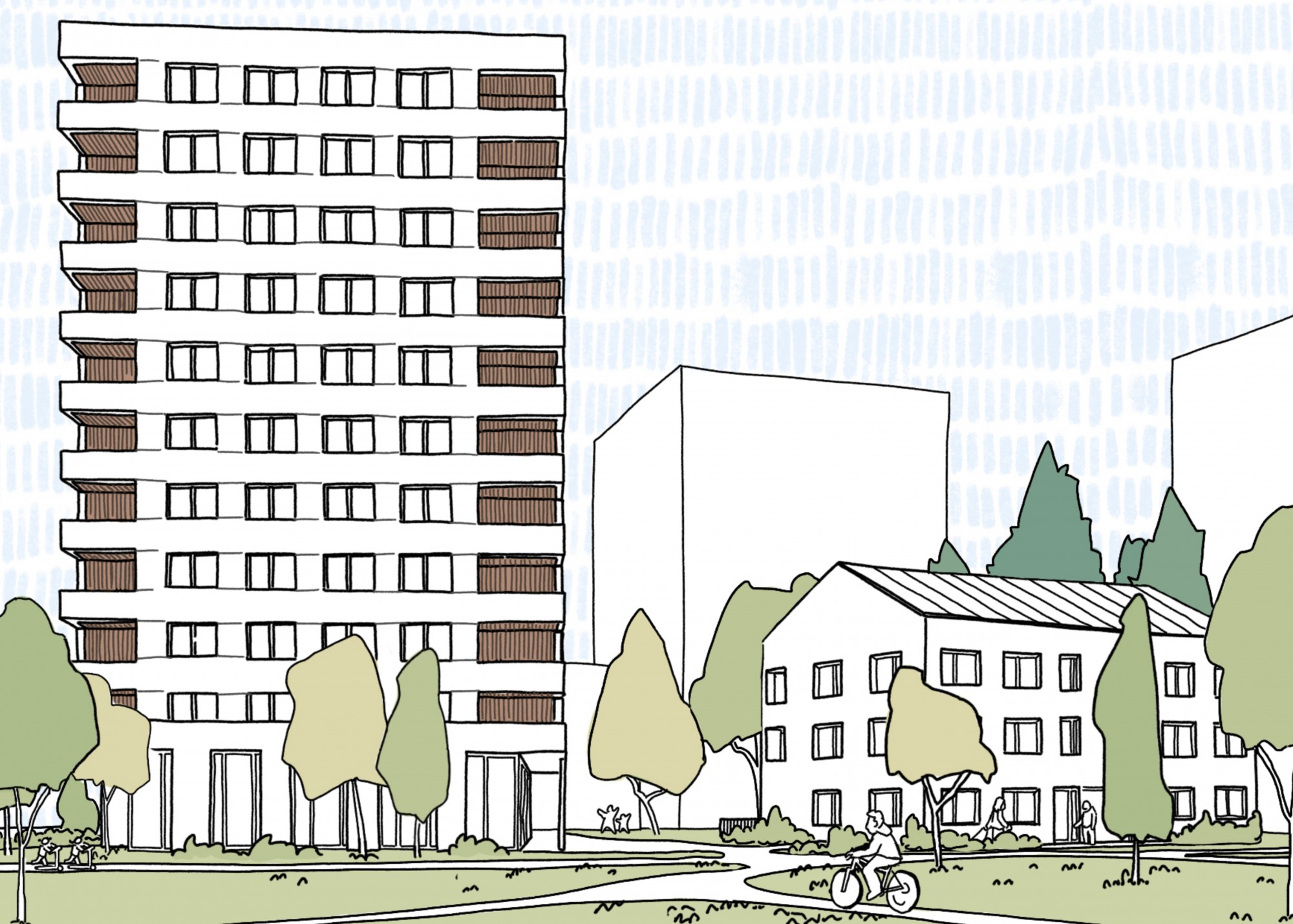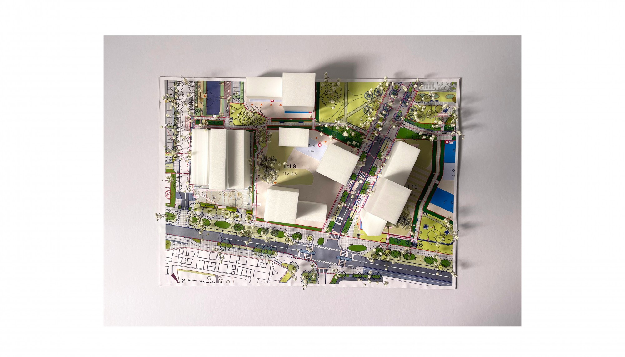 Le site, situé à la croisée de l’avenue de Rochester et de la rue Ropartz, s’ouvre sur un grand jardin ; il offre l’opportunité de penser la transition entre l’avenue et le paysage. Le projet s’appuie sur cette situation d’interface pour ménager un contact généreux entre le bâti et le sol. Le rez-dechaussée, largement ajouré, accueille les traversées, les halls et les locaux partagés ; il fait respirer la ville. L’habitat s’élève ensuite en deux ensembles orientés nord-sud, dont les masses alternent selon les niveaux : un socle à R+3/4 formant la base urbaine, surmonté de tours à R+10 qui émergent audessus de la canopée. Entre ces deux régimes — l’horizontalité du socle et la