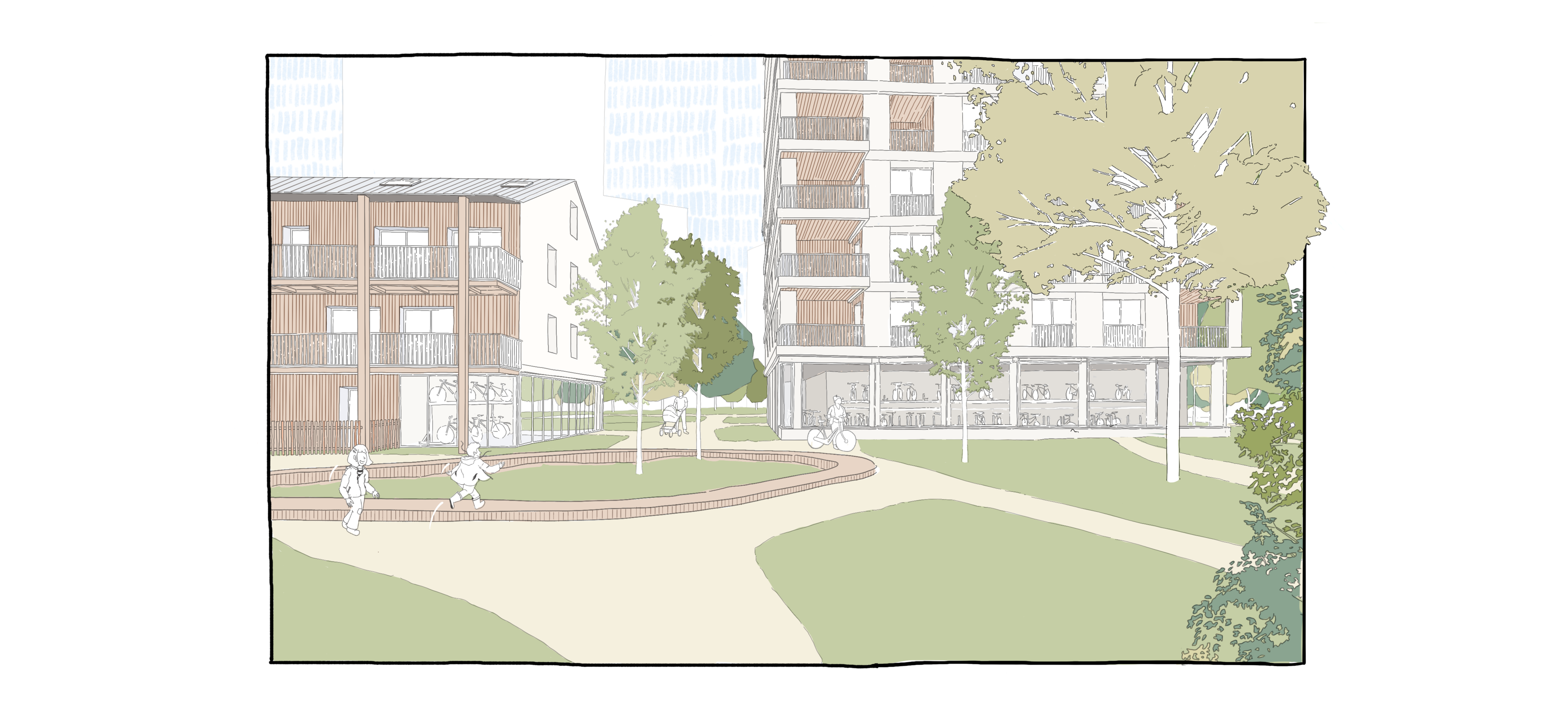 jardins privatifs protégés par des haies basses ; dans les étages, les loggias se disposent comme des retraits dans la masse, tamisant la lumière et ménageant l’intimité.