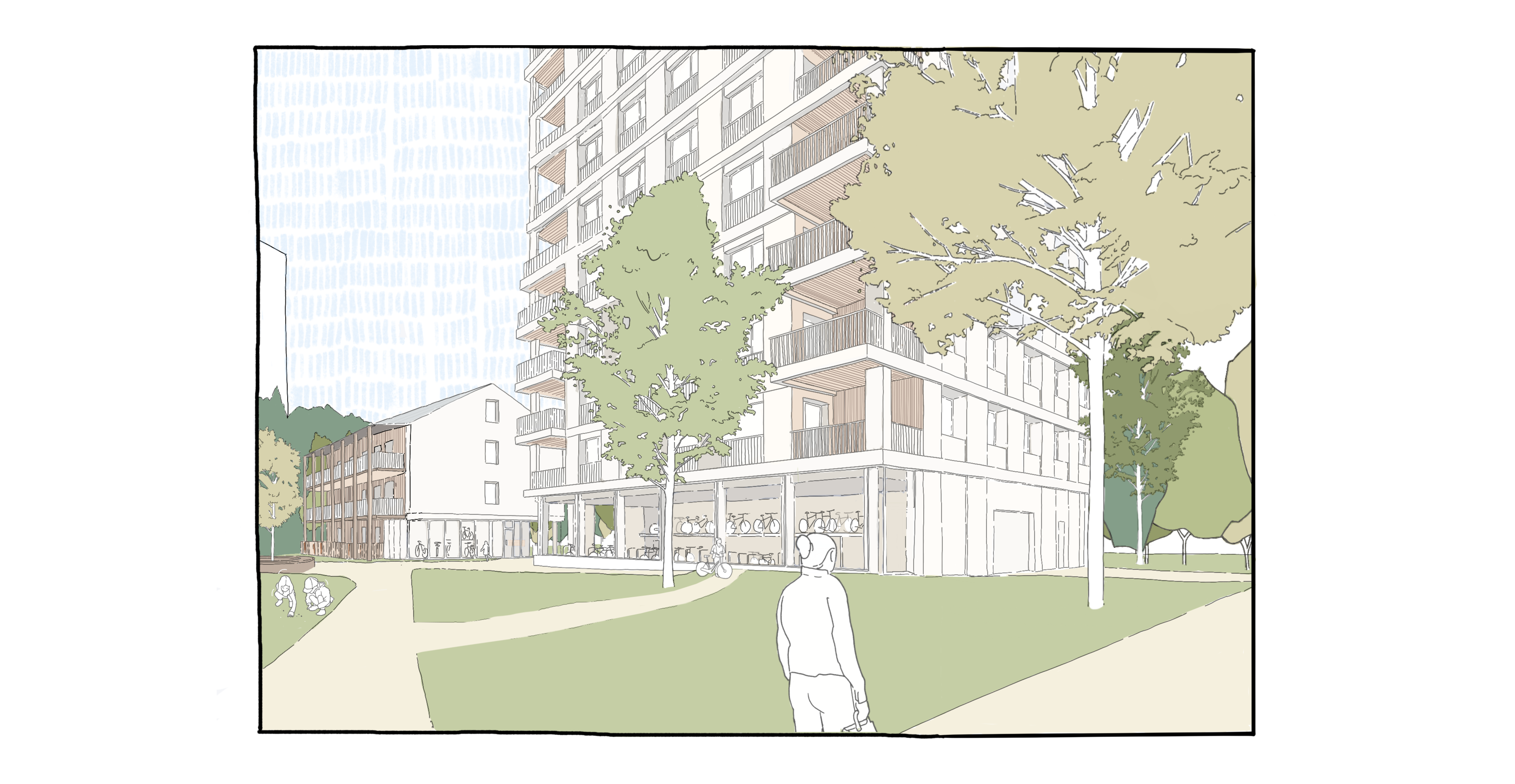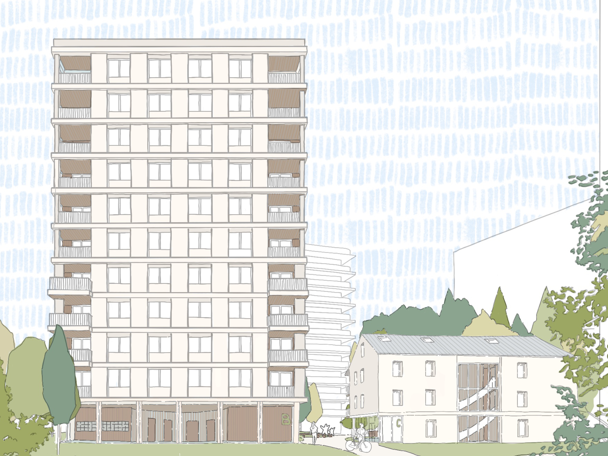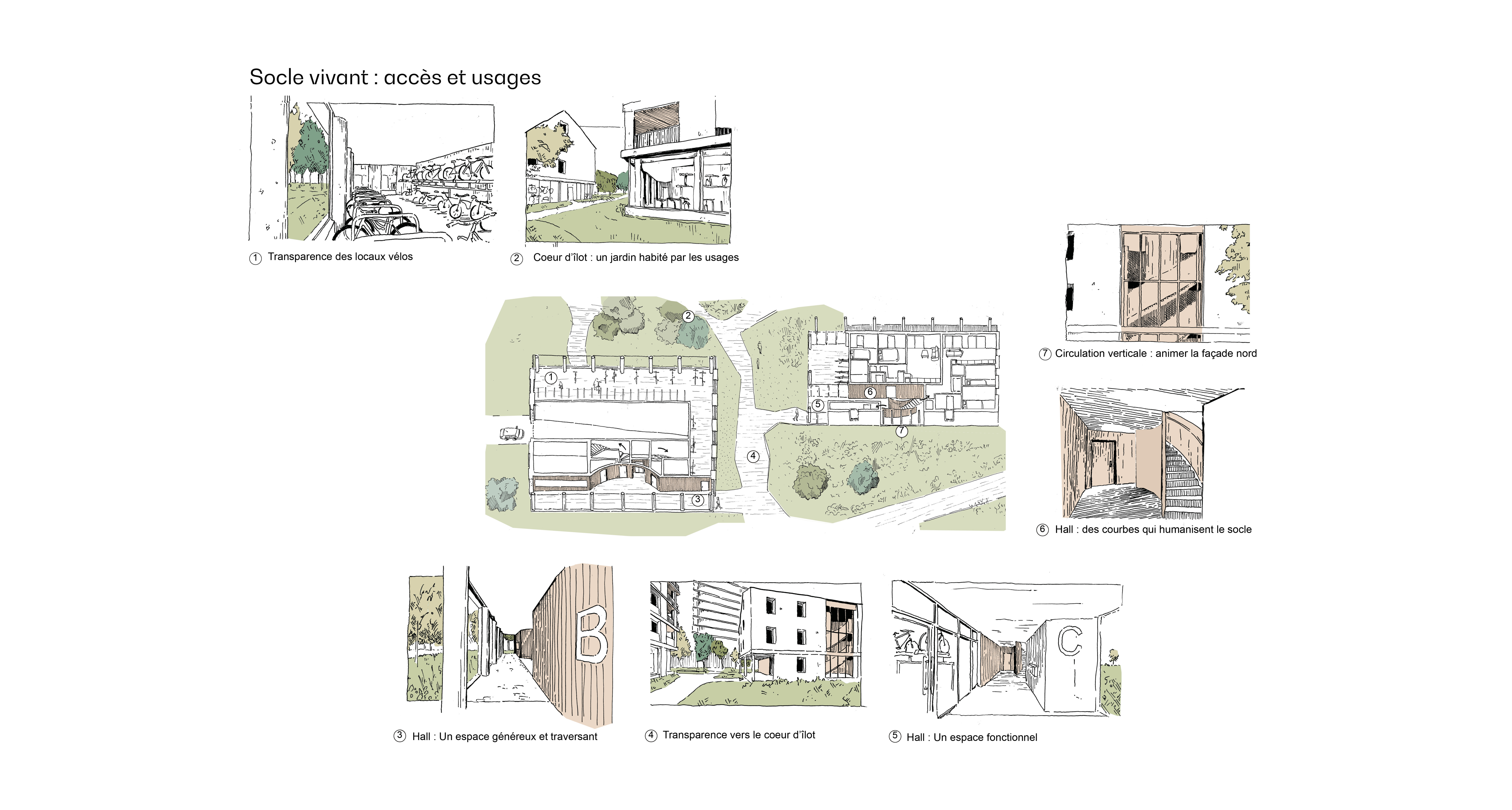 Le site, situé à la croisée de l’avenue de Rochester et de la rue Ropartz, s’ouvre sur un grand jardin ; il offre l’opportunité de penser la transition entre l’avenue et le paysage. Le projet s’appuie sur cette situation d’interface pour ménager un contact généreux entre le bâti et le sol. Le rez-dechaussée, largement ajouré, accueille les traversées, les halls et les locaux partagés ; il fait respirer la ville. L’habitat s’élève ensuite en deux ensembles orientés nord-sud, dont les masses alternent selon les niveaux : un socle à R+3/4 formant la base urbaine, surmonté de tours à R+10 qui émergent audessus de la canopée. Entre ces deux régimes — l’horizontalité du socle et la verticalité des émergences — s’installe une continuité douce, où les strates du projet se répondent.