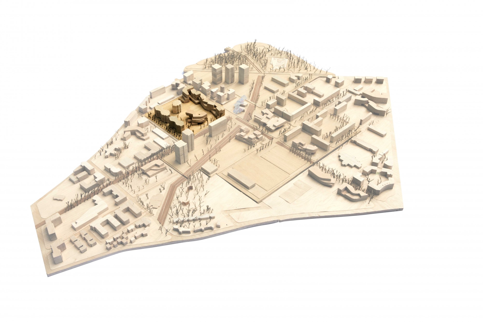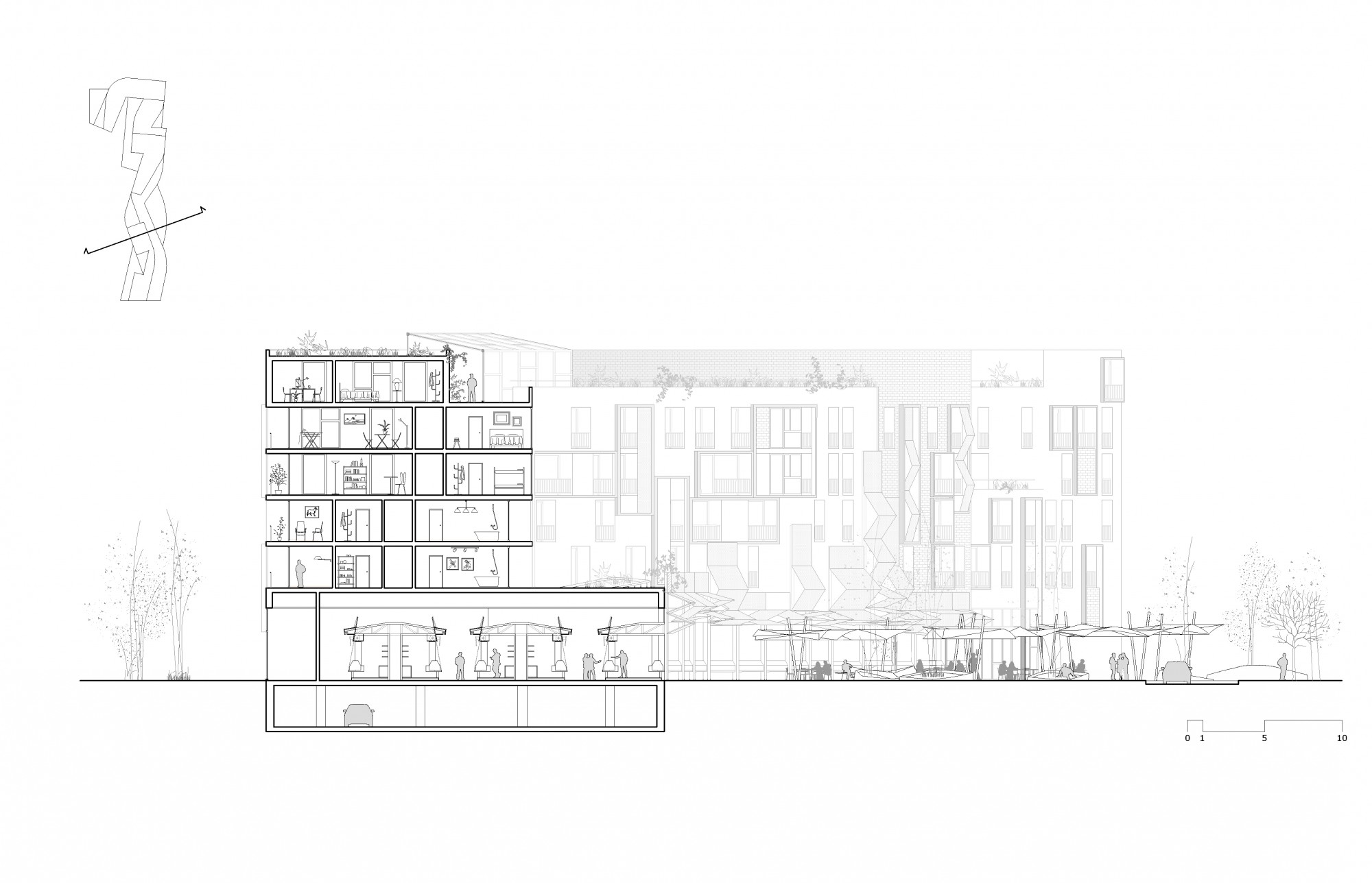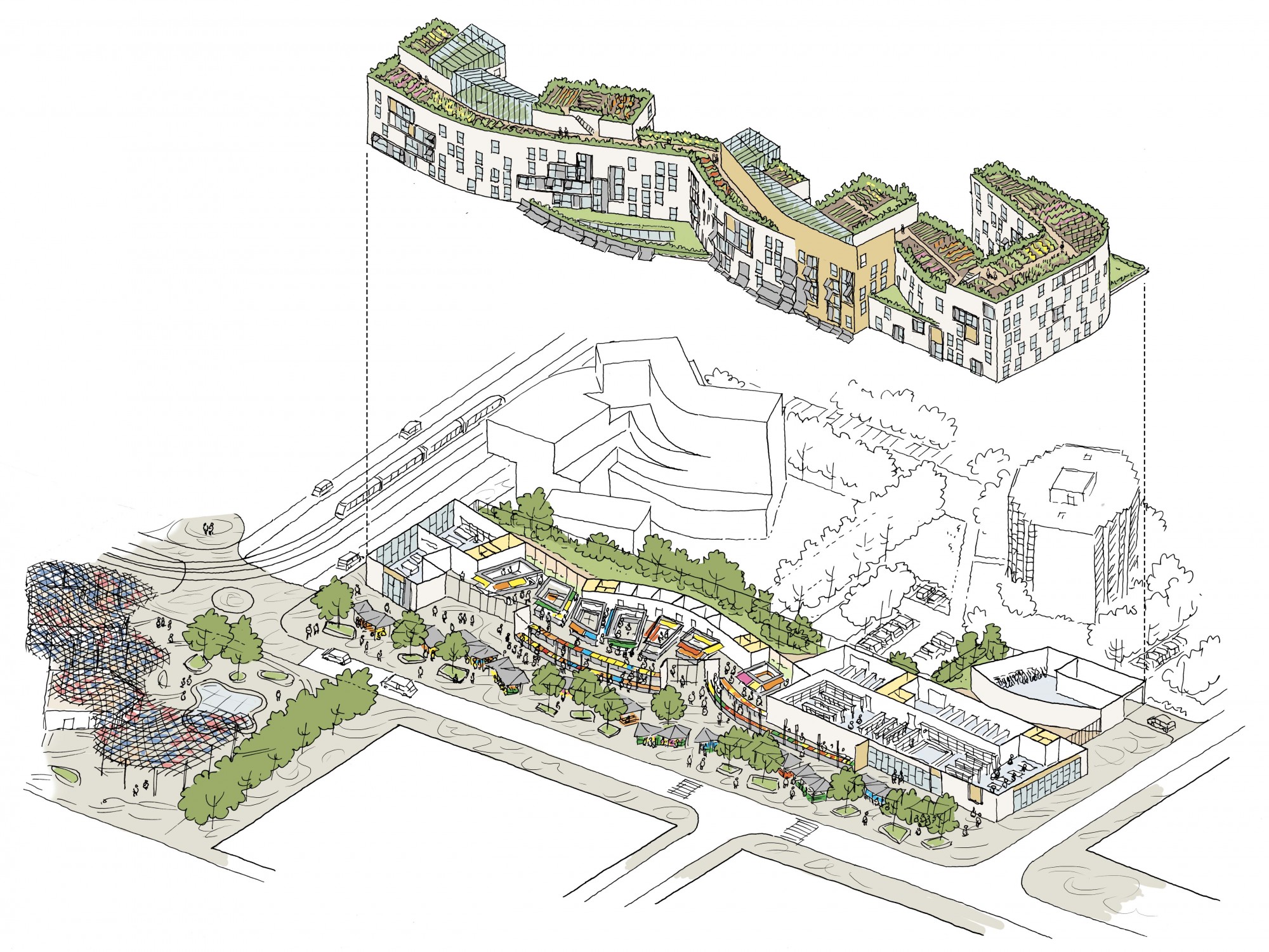 -Le marché : une halle alimentaire et des surfaces de vente spécialisées, conçues comme un espace multifonctionnel et évolutif. Connecté au marché forain et à la ville, il bénéficie d’une façade amovible ouverte sur le parvis, facilitant la spatialisation des flux.