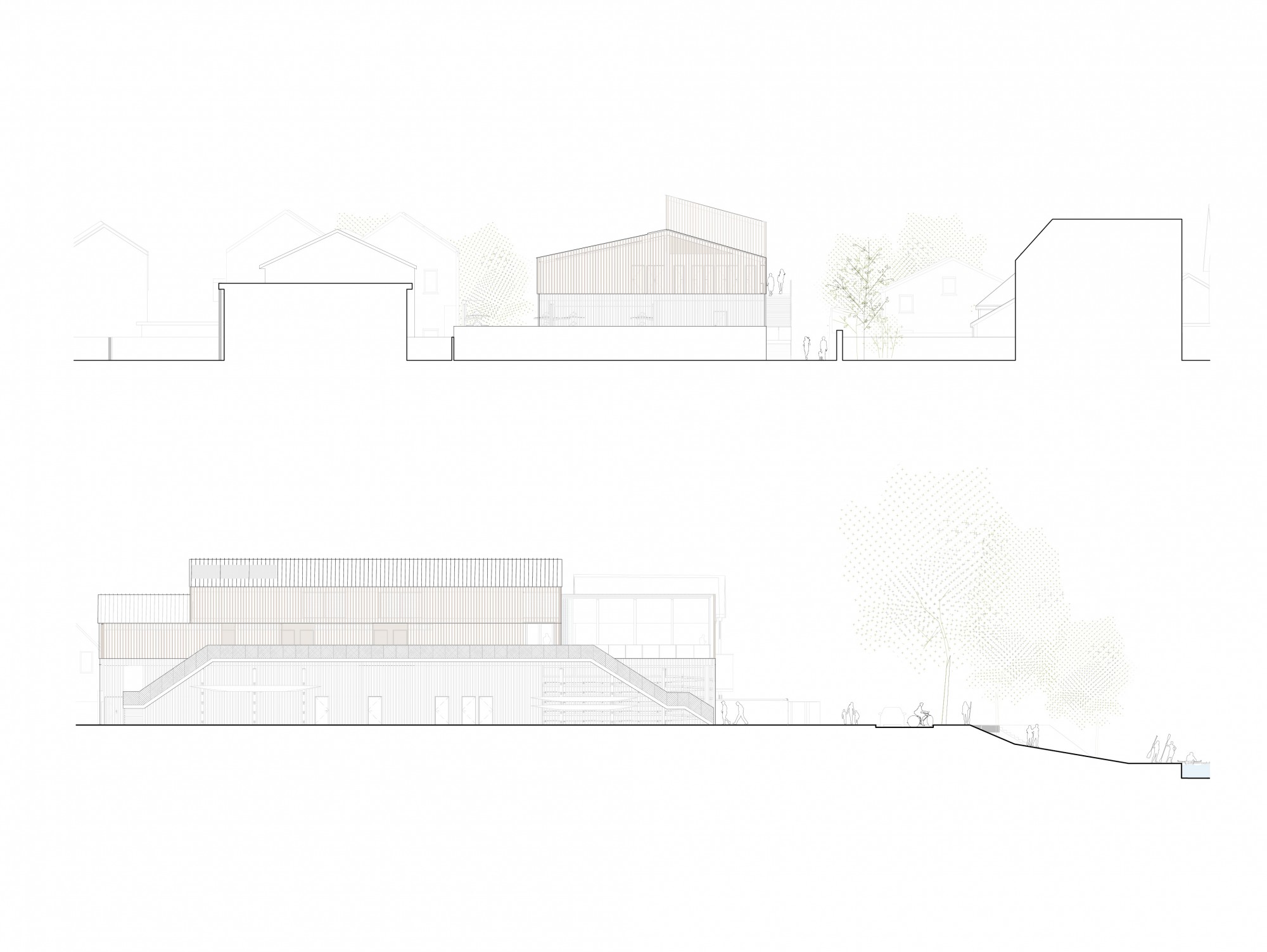 Le dessin des façades est l’expression de nos intentions architecturales ; le bâtiment se développe par strates continûment dans le paysage. La trame des lattis structure son assise horizontale, tandis que les lignes de toiture légères se déploient et soulignent leur rapport au ciel, le tout formant une unité, calme et sereine.