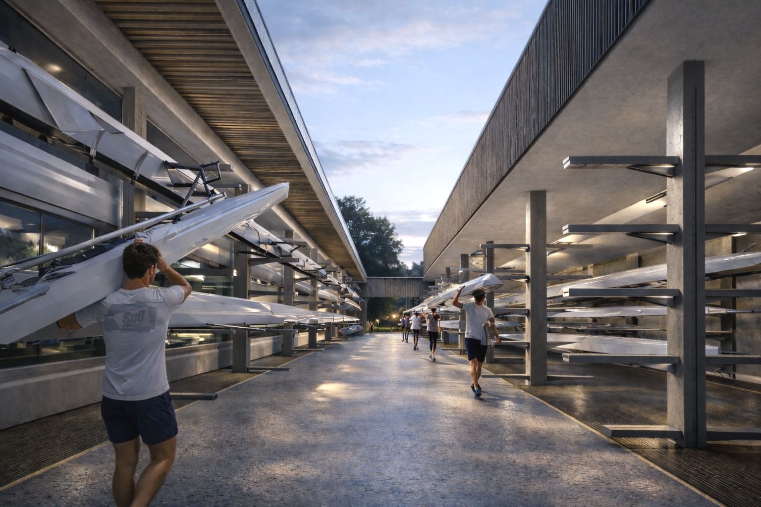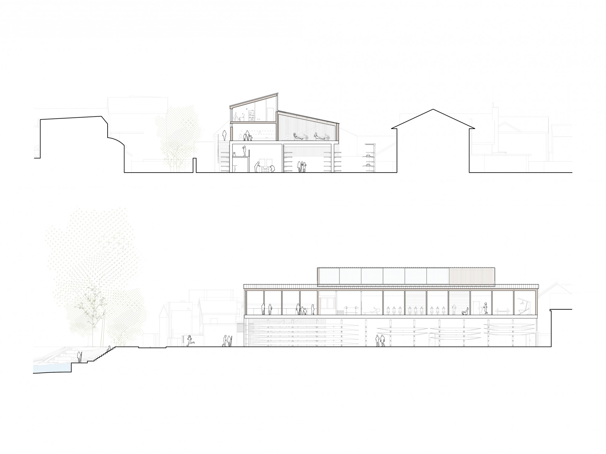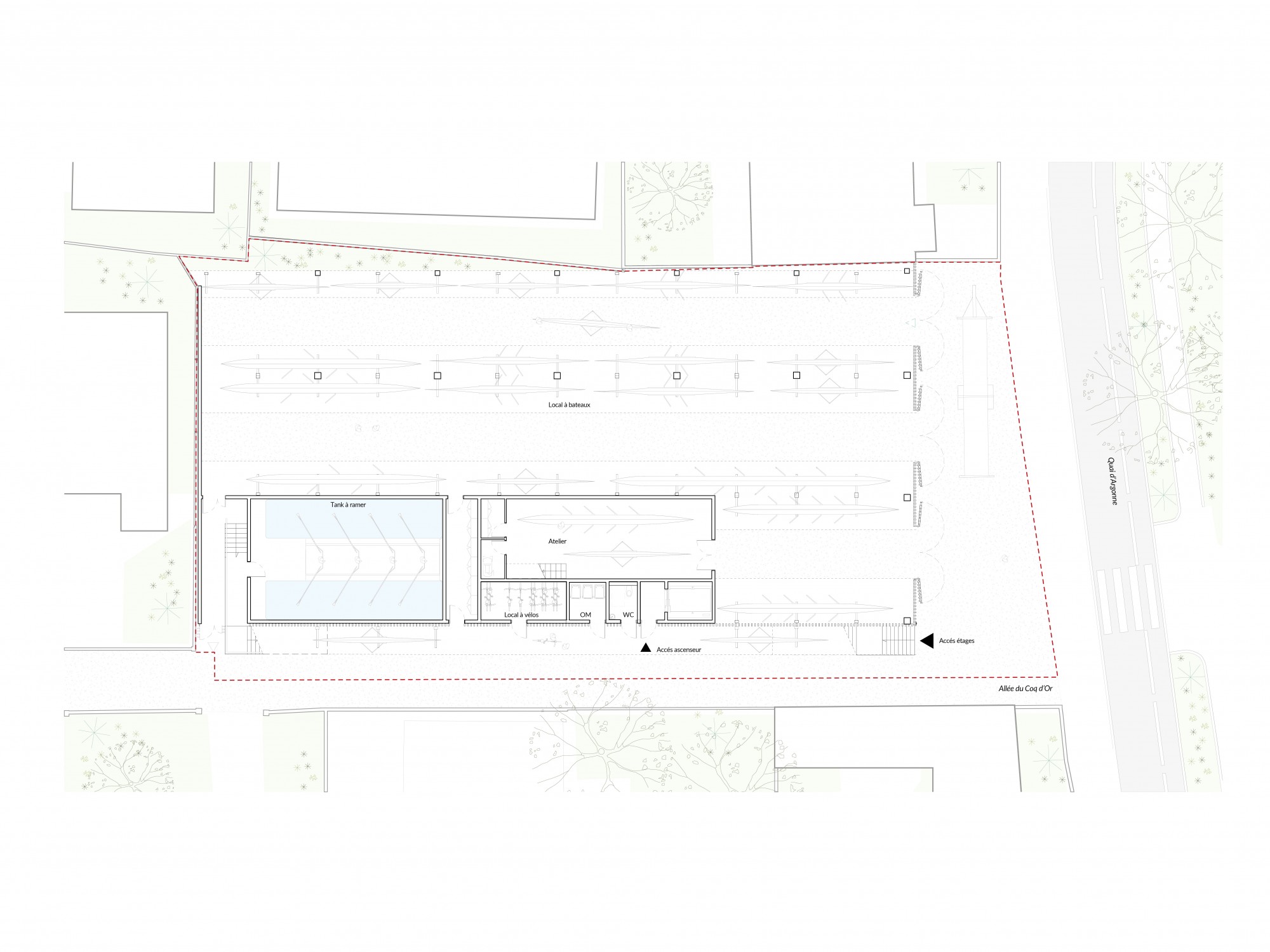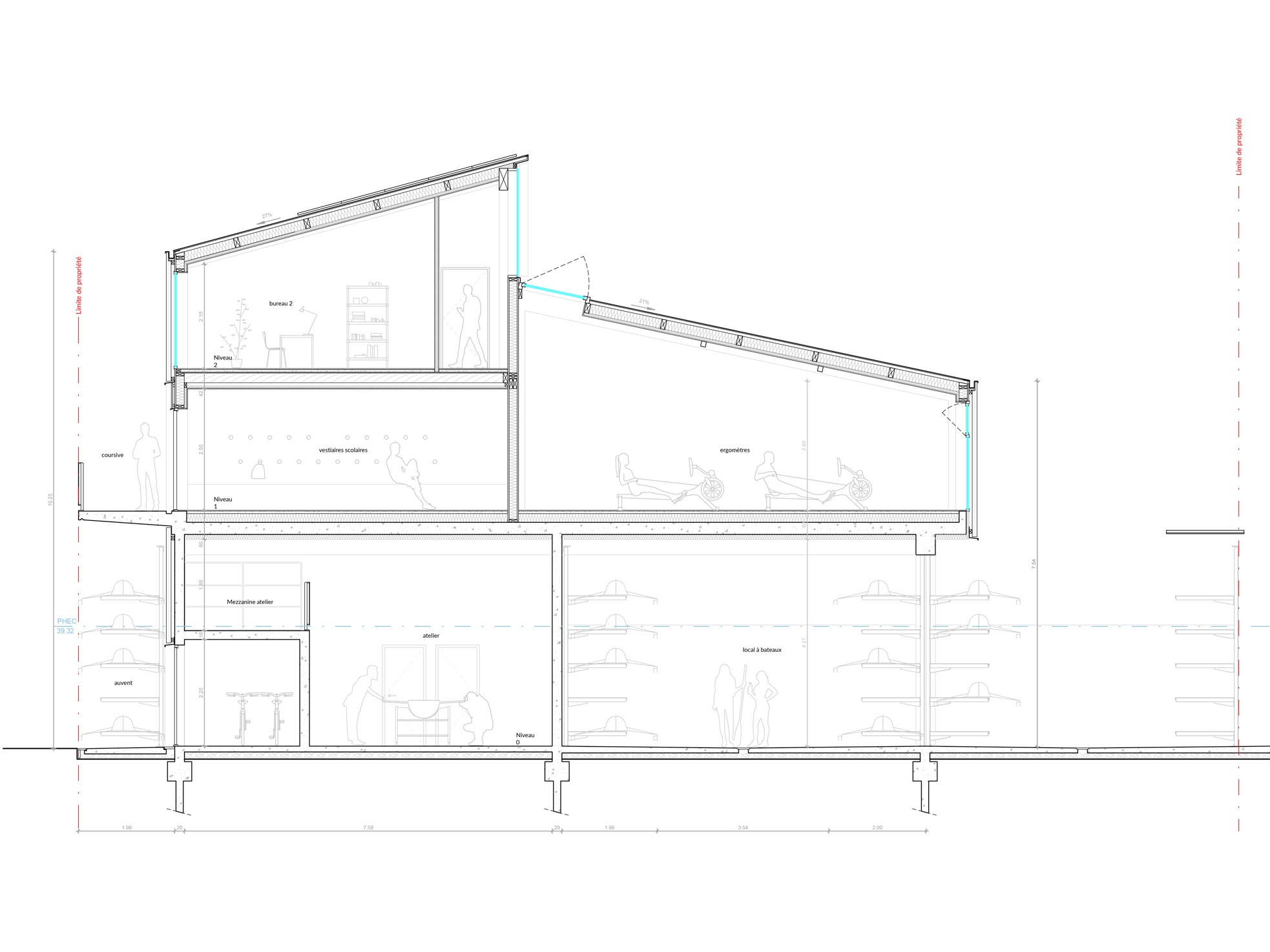 Mais le travail en coupe est également décisif ; les vestiaires surplombent le tank à ramer et l’atelier pour faciliter les accès, la maintenance des réseaux et éviter les risques de fuite dans le local à bateaux, les locaux techniques surmontent les vestiaires pour fournir les besoins en fluide au plus près des points de puisage, etc.