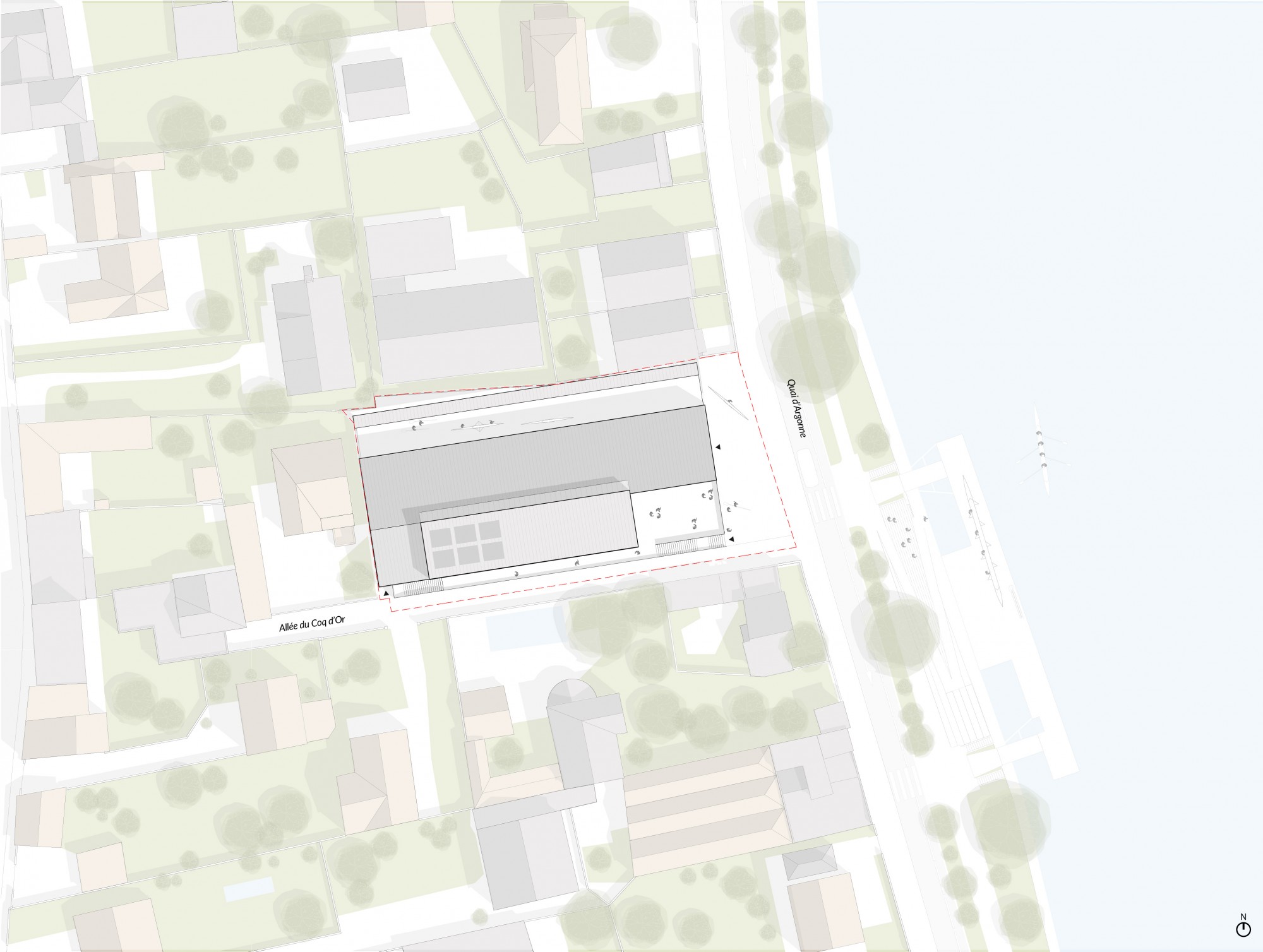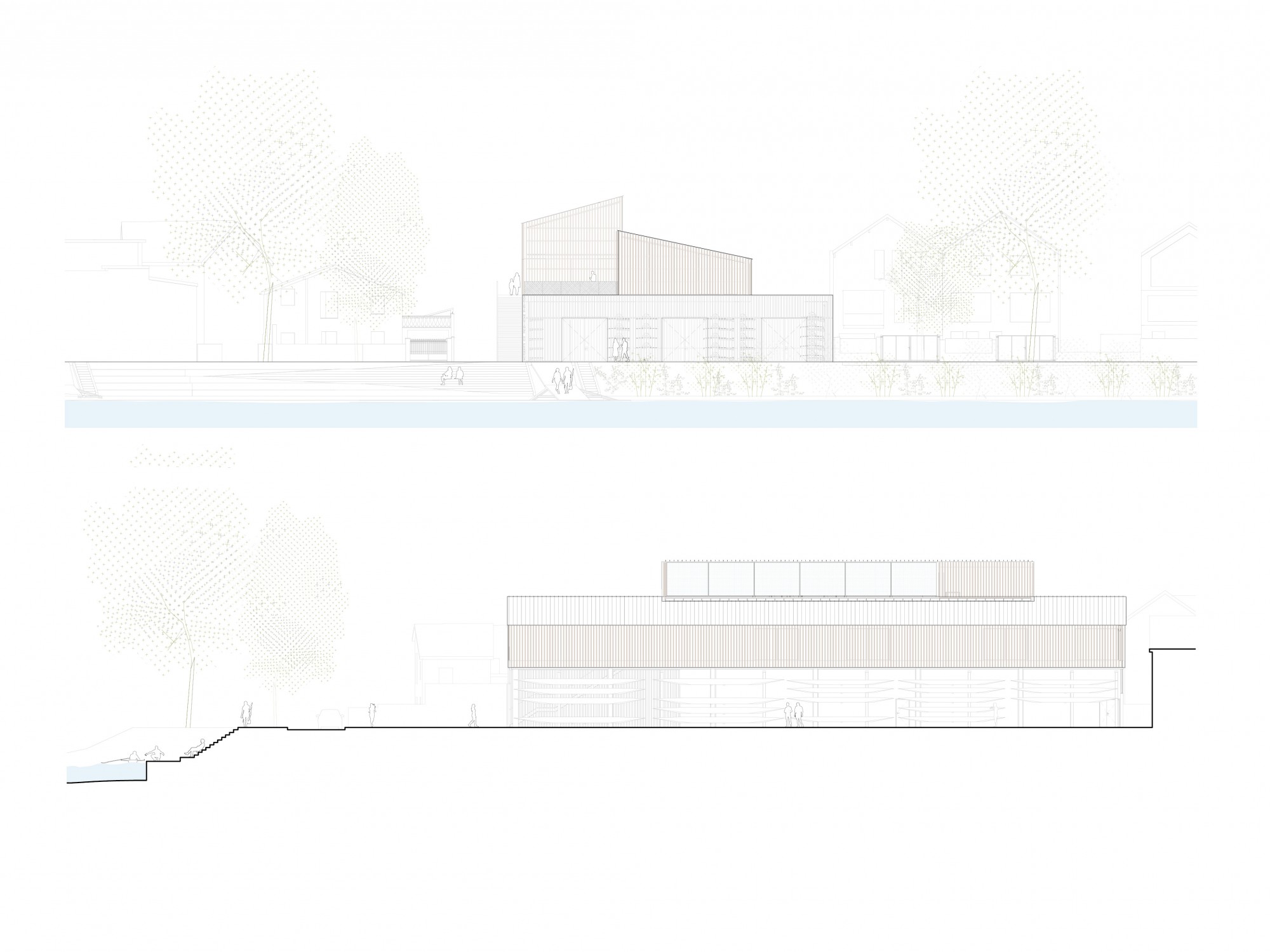 Ce dispositif autonomise la forme en l’émancipant des limites parcellaires et organise une relation à la ville et au paysage analogue à ces porosités orchestrées par les venelles ; l’air, la lumière et le regard traversent de tous côtés de sorte que le futur centre nautique et les habitations voisines bénéficient de vues et de respirations vers le ciel et la Marne.