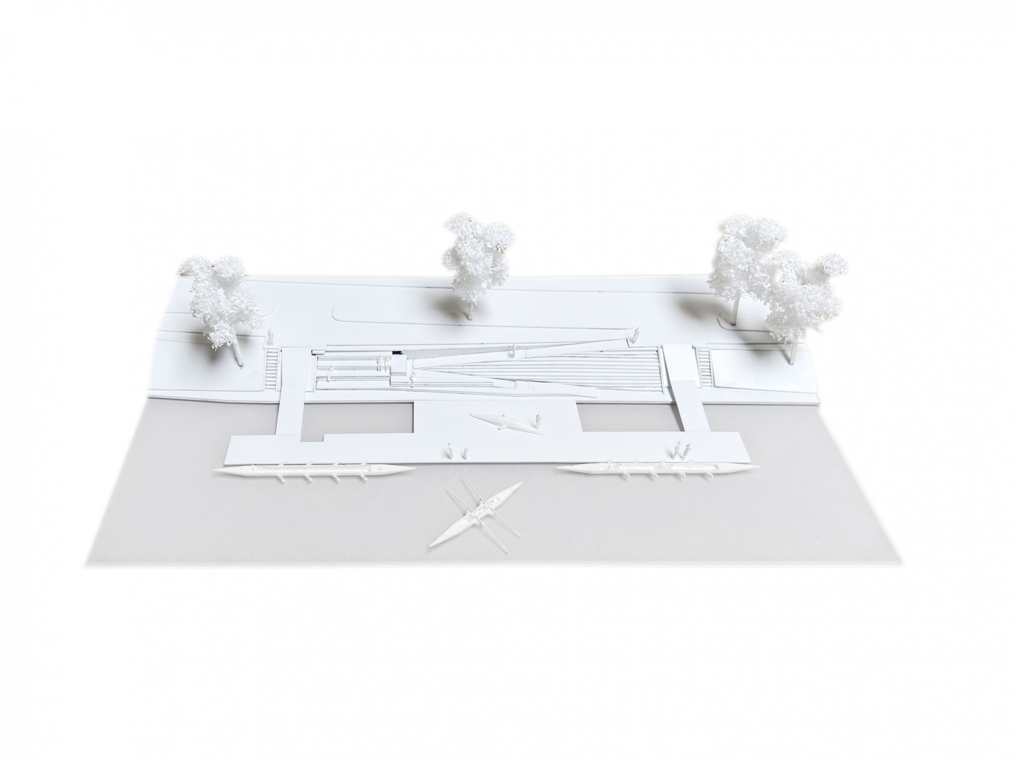 Le traitement de ces volumes participe d’une volonté de mise en cohérence par le déploiement d’un dispositif de clairevoies unifiant les façades tout en les différenciant par le dessin et la matière selon les niveaux et les usages. Ainsi, le socle est revêtu d’un barreaudage vertical le long du local à bateaux tandis que les volumes bois en émergence sont revêtus d’un lattis bois vertical, agissant tel un filtre selon le degré de porosité, grâce au resserrement ou au relâchement de ses plis, qui dissimulent, ou à l’inverse, donnent à voir, les usages.
