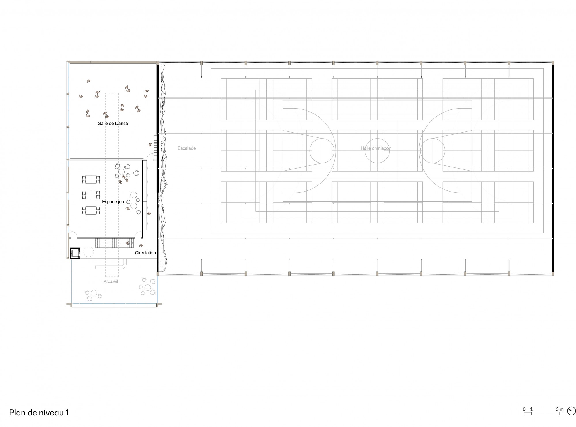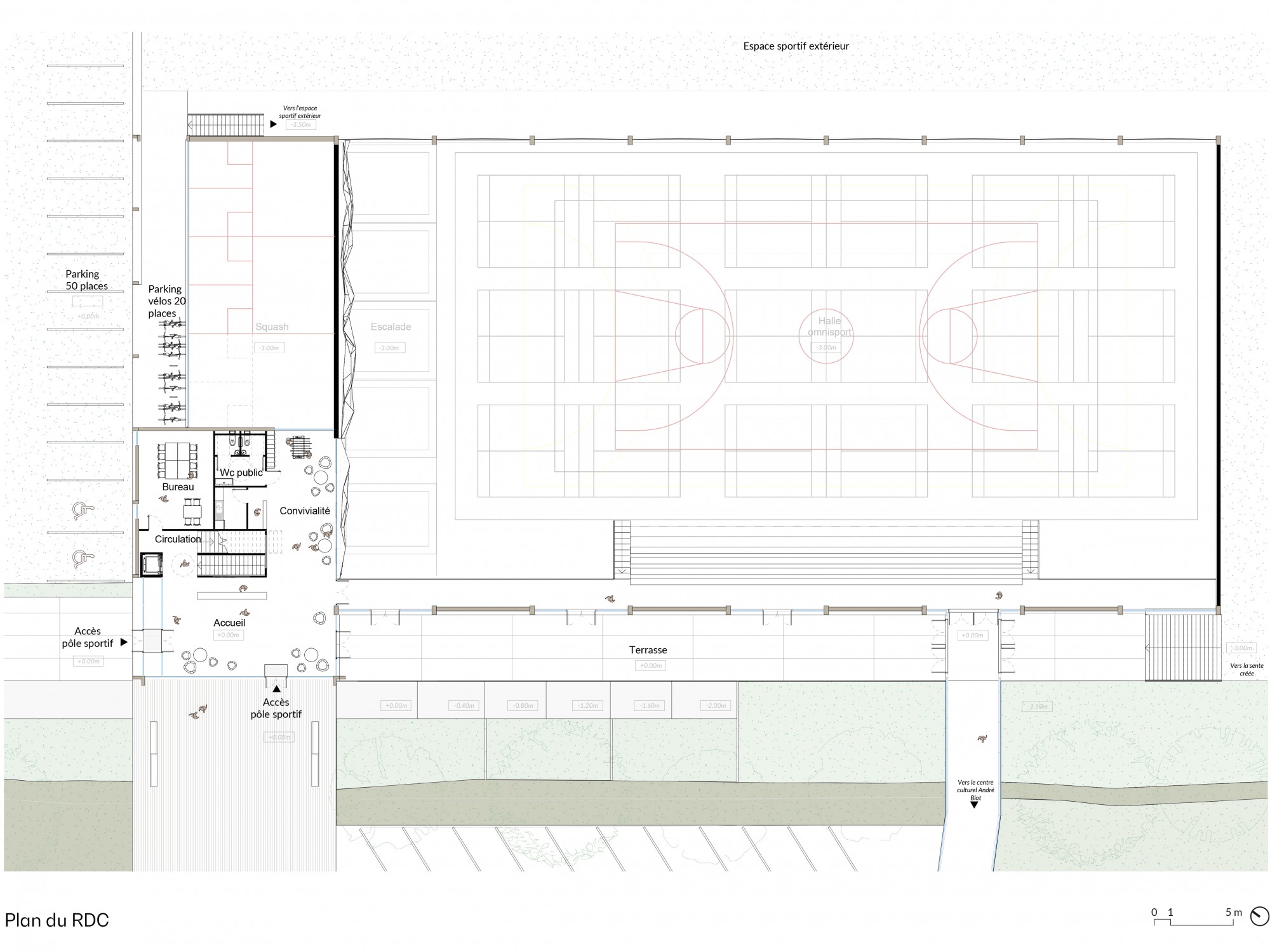 -La « Maison des Sports », regroupant l’accueil, les espaces de convivialité et les salles sportives et ludiques.