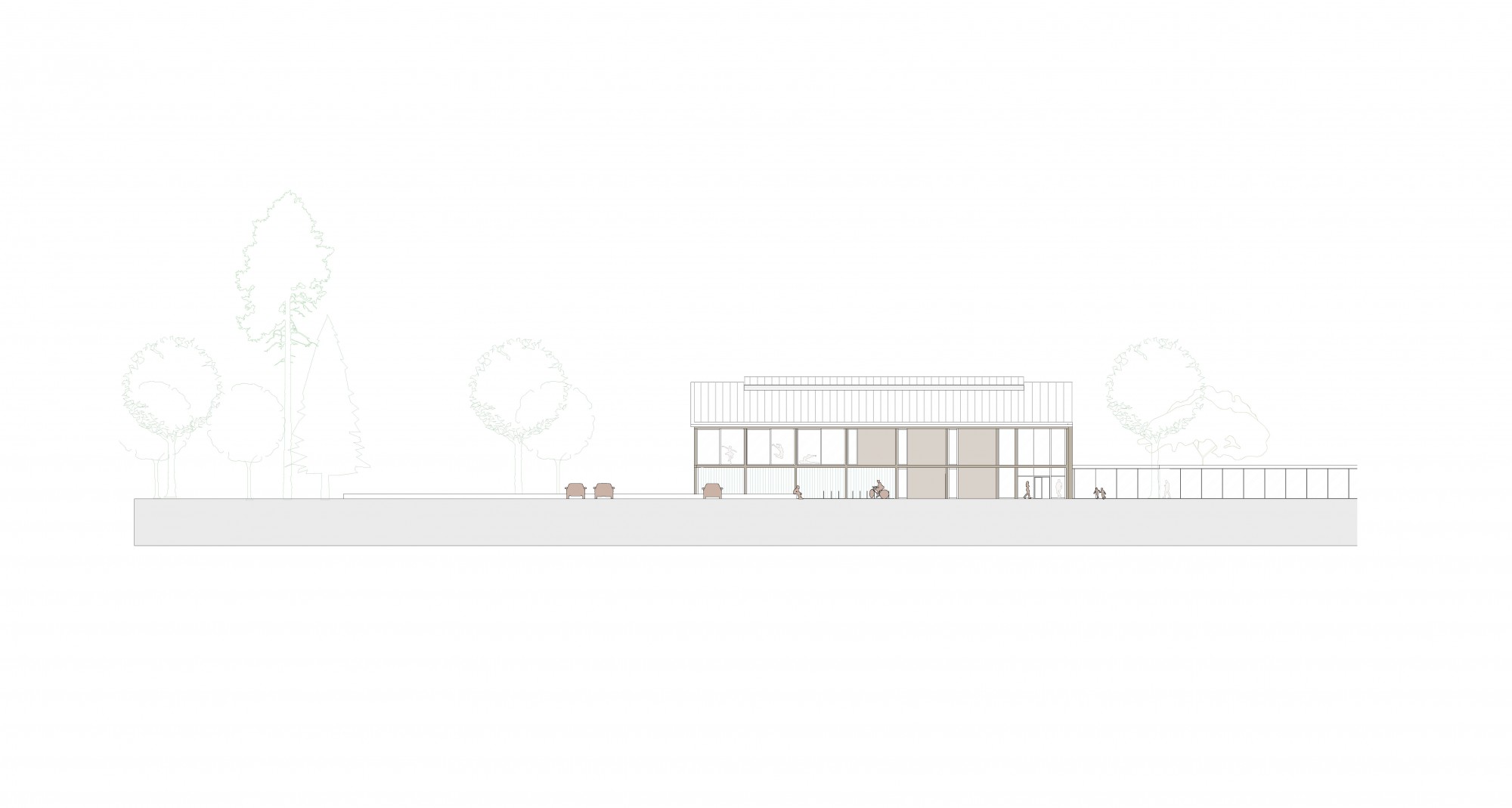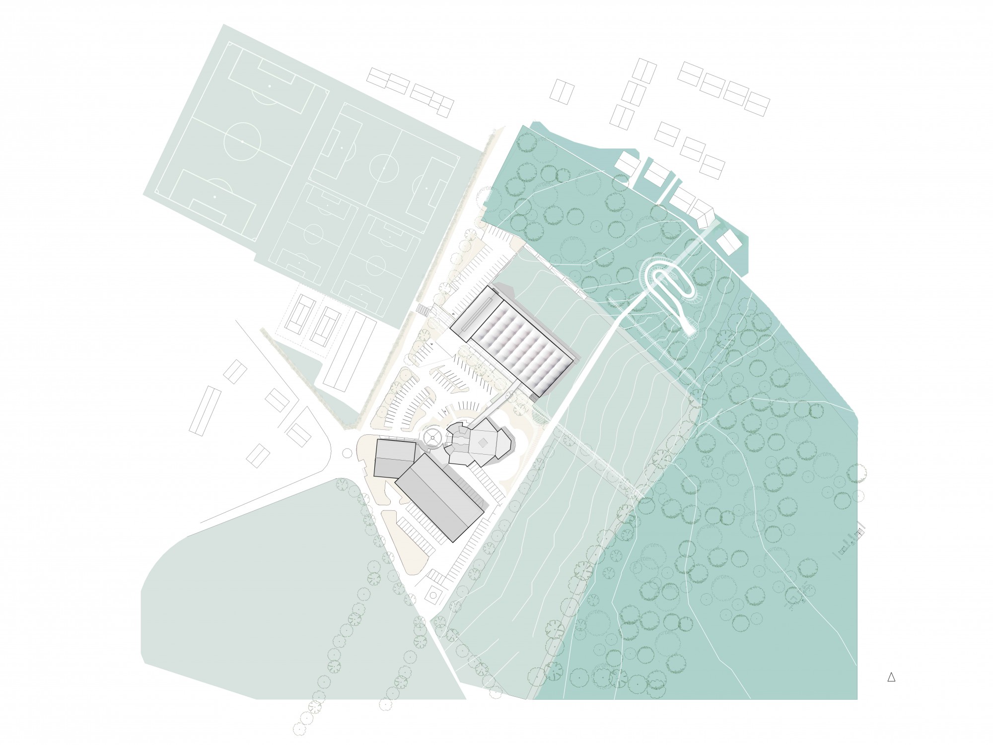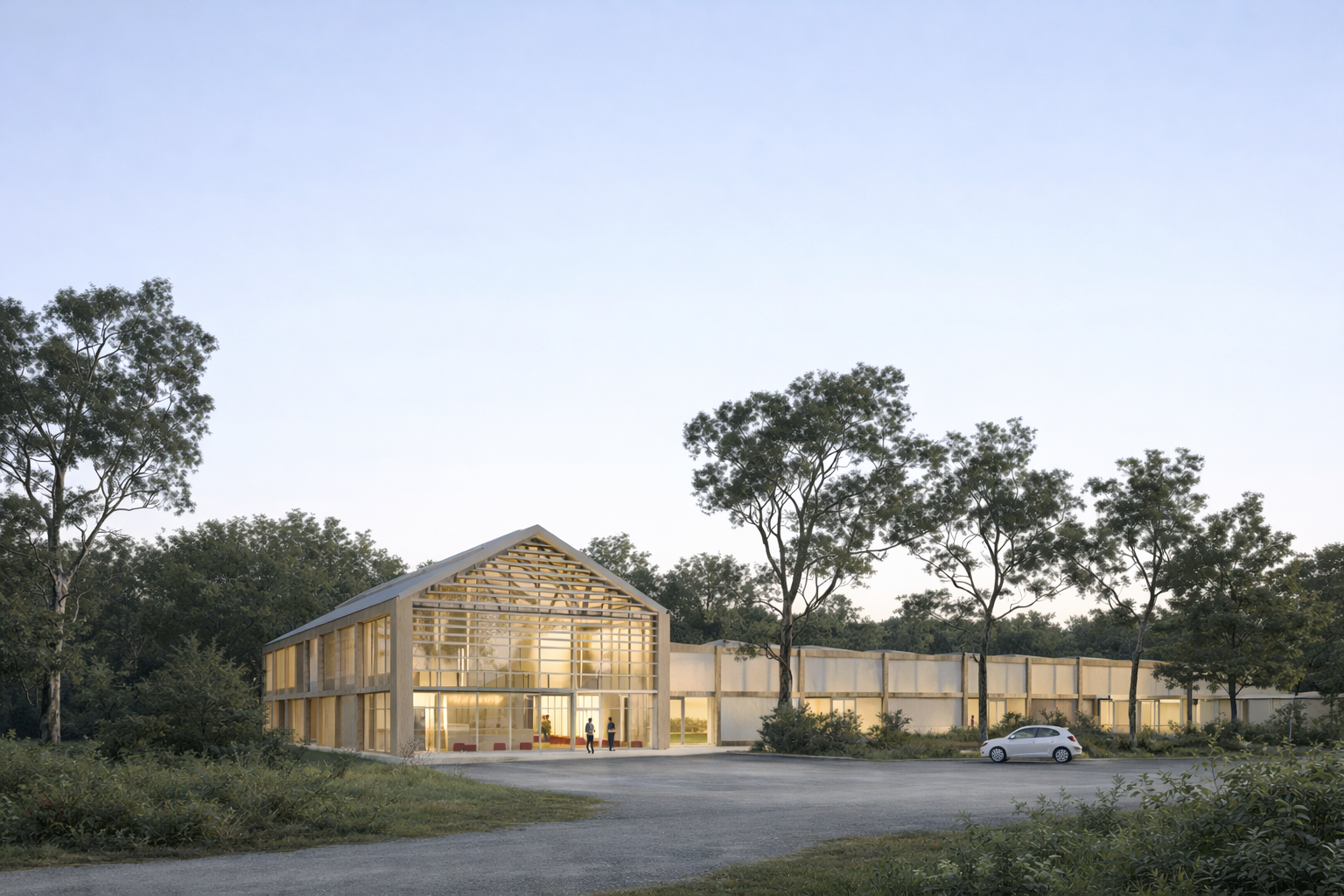 Implanté le long du bocage existant et orienté vers les équipements déjà en place, le bâtiment vient structurer une nouvelle centralité.