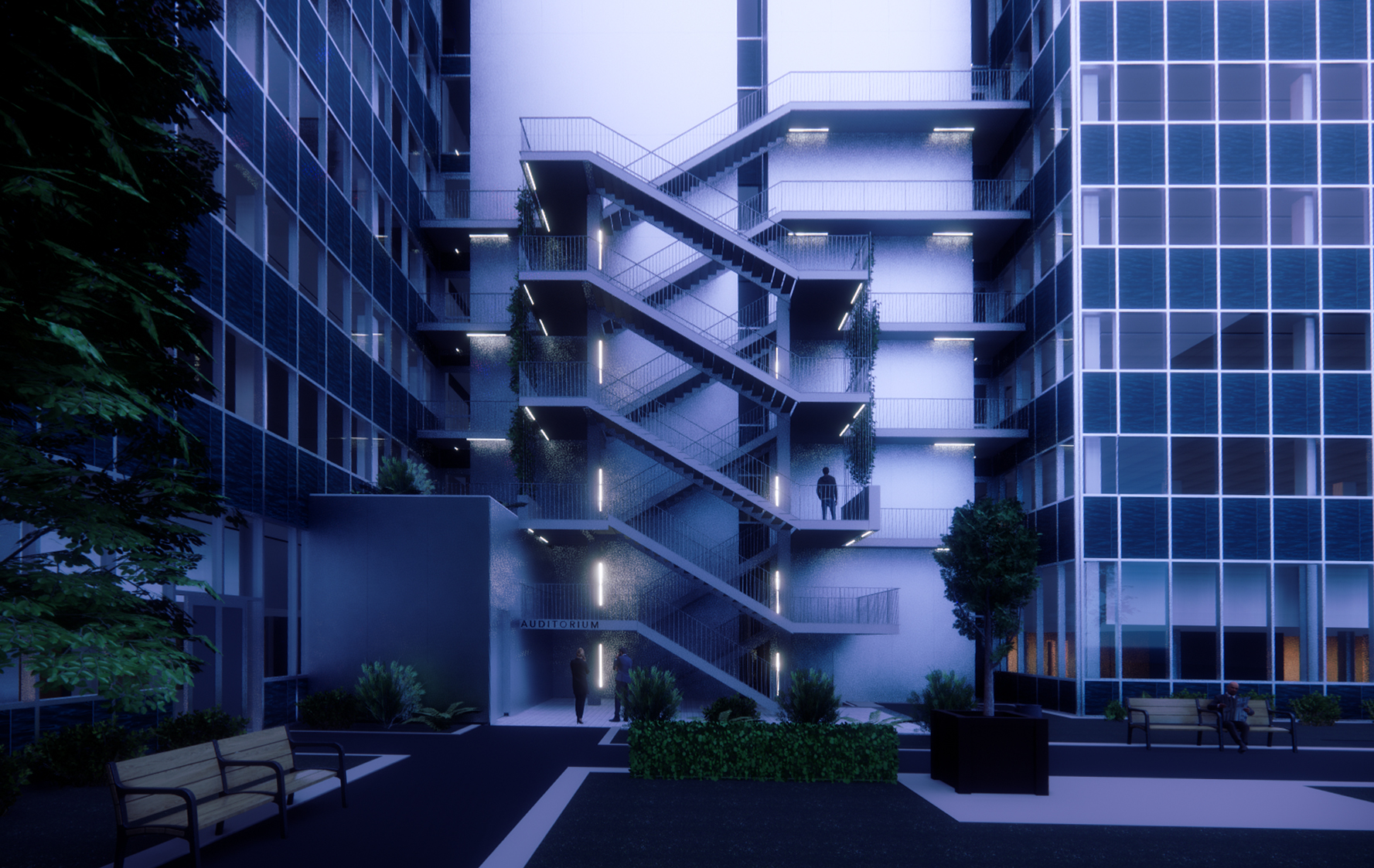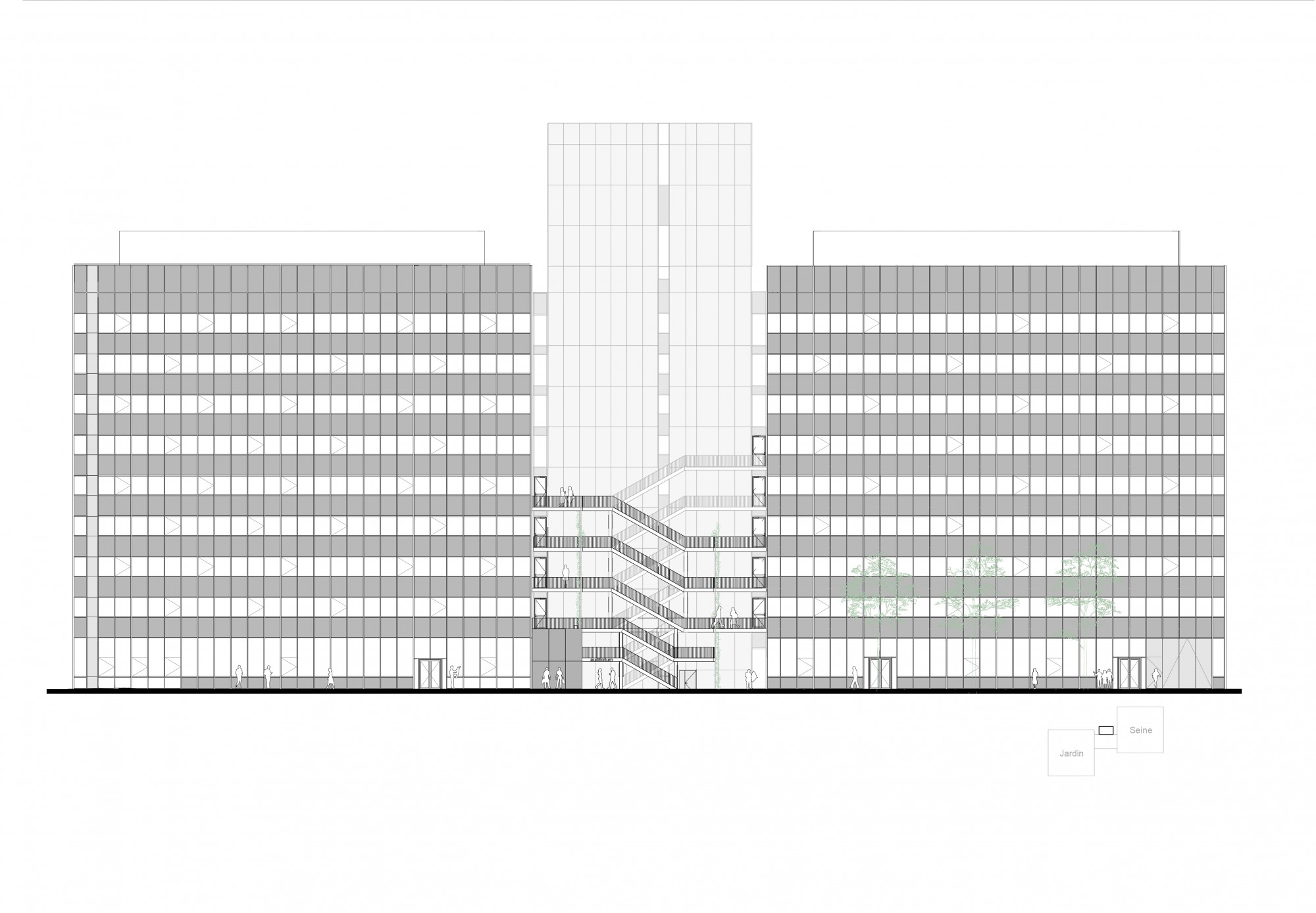 Le bâtiment A fait l’objet d’une restructuration partielle. L’augmentation de la densité des plateaux par niveau a nécessité la construction d’un nouvel escalier de secours. En outre, un centre d’affaires et une salle de fitness ont été créés au niveau du jardin, enrichissant ainsi la gamme de services du site.