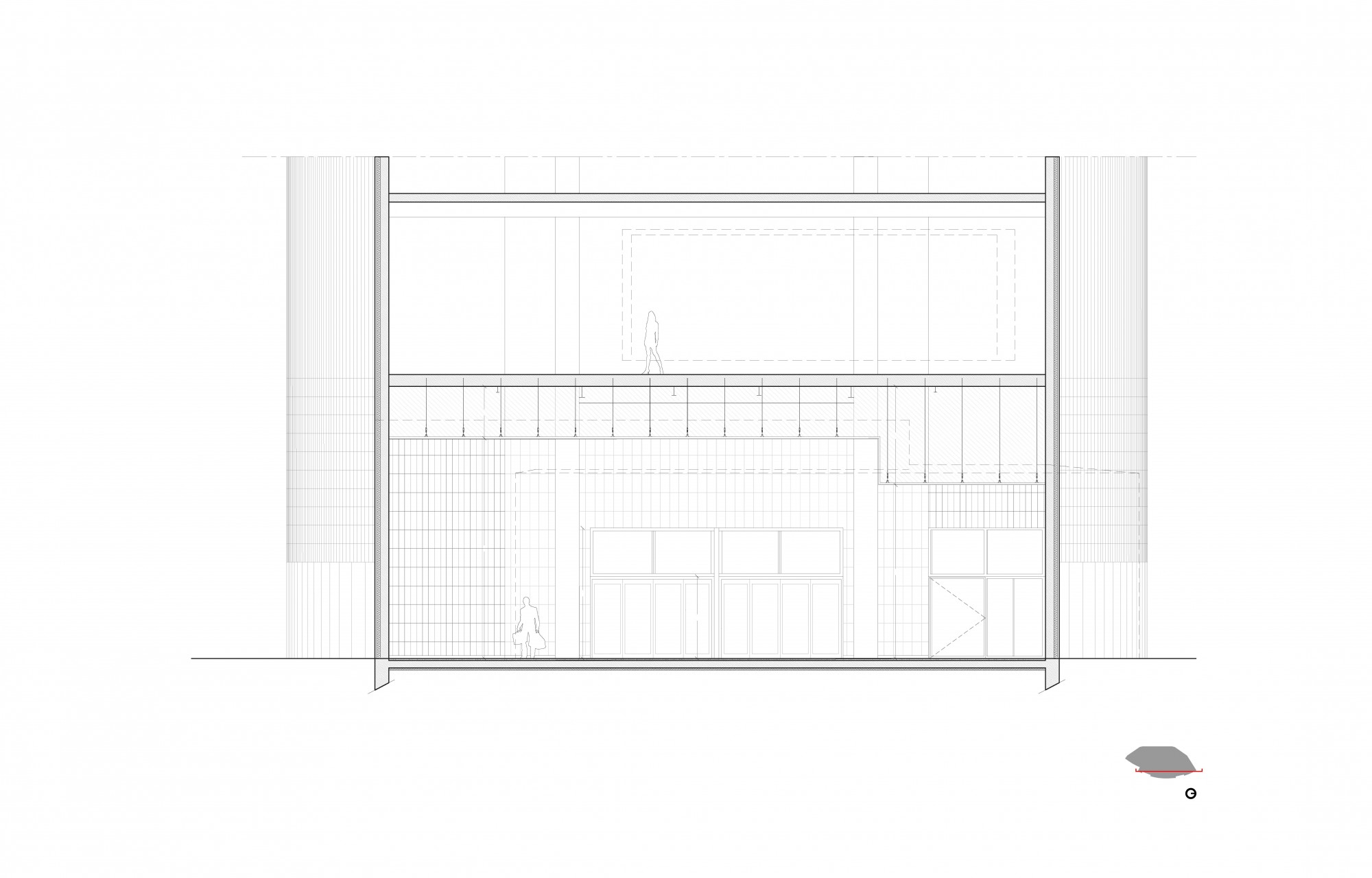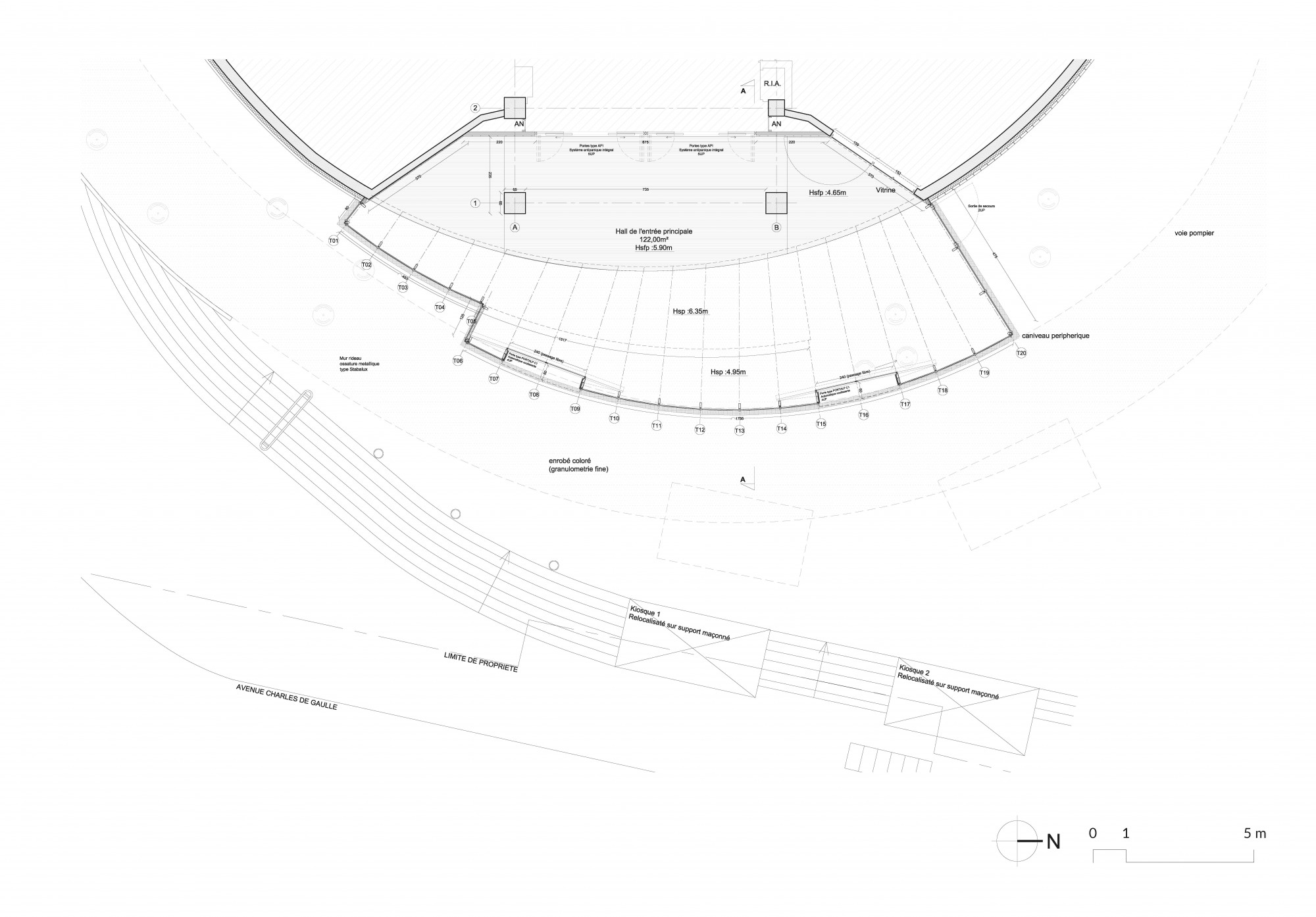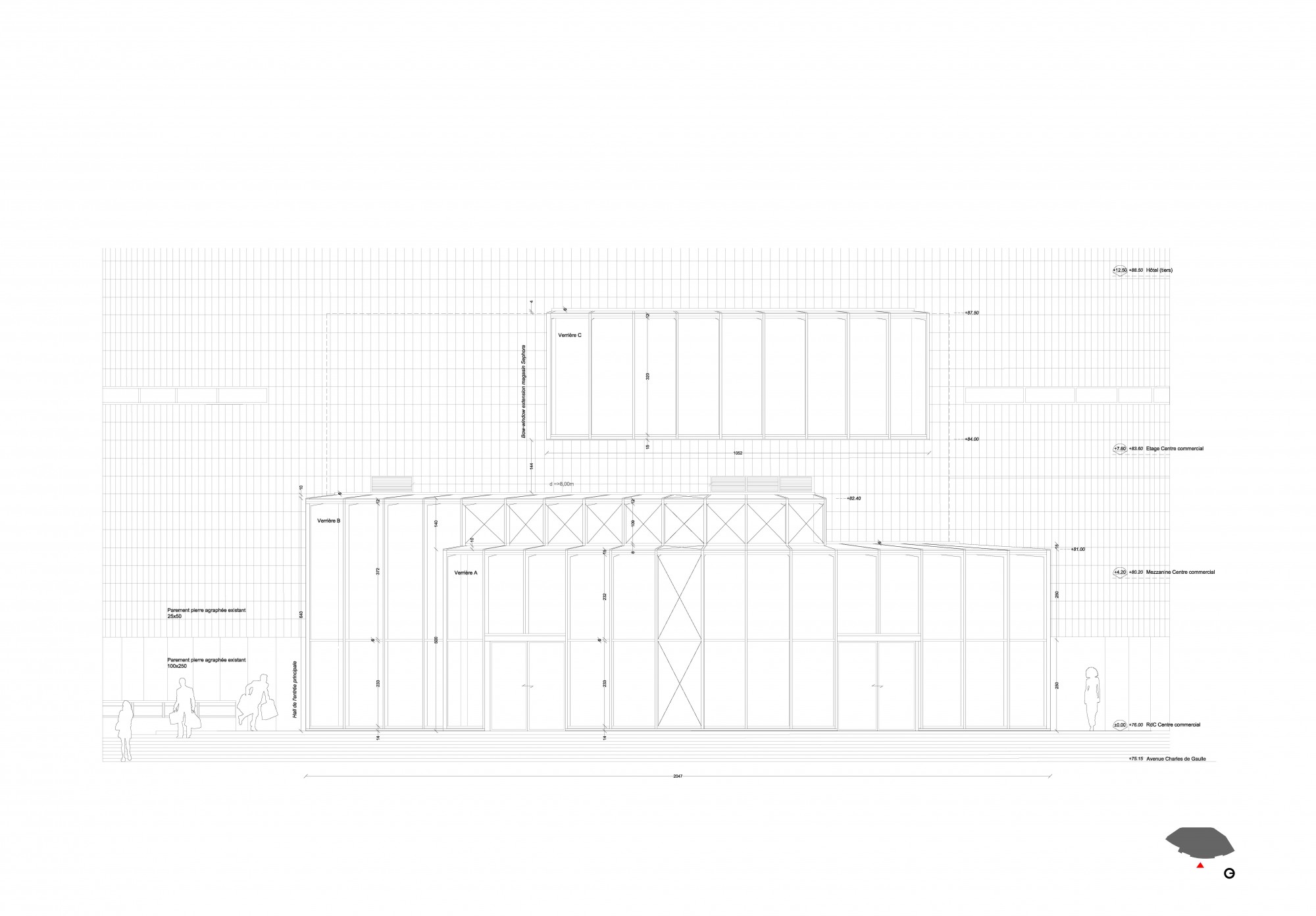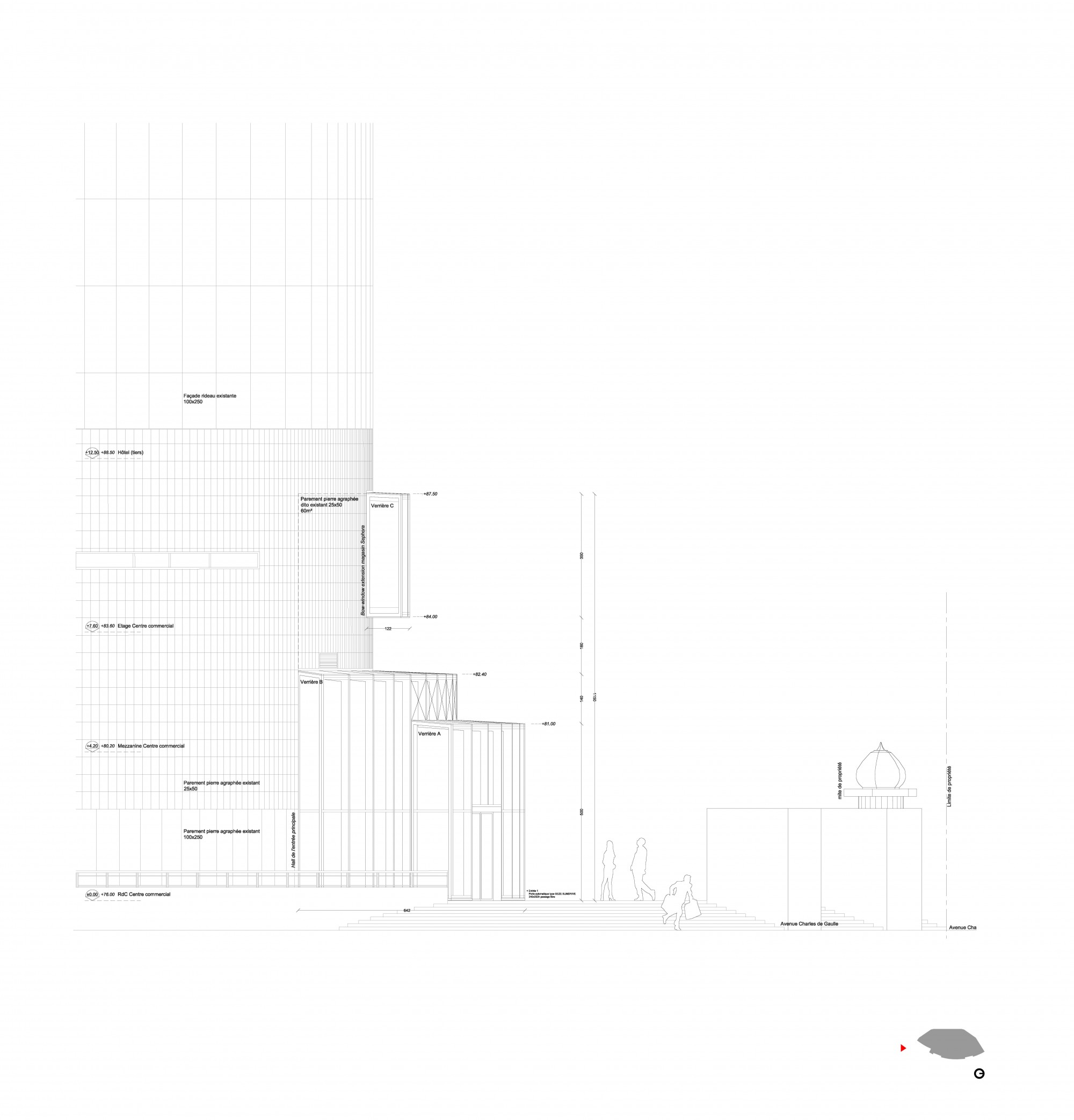 Ainsi, l’entrée secondaire et le sas créés sur la passerelle PIR reçoivent un traitement minimal, par la création de façades homogènes avec l’existant, dans la continuité des surplombs de l’édifice.